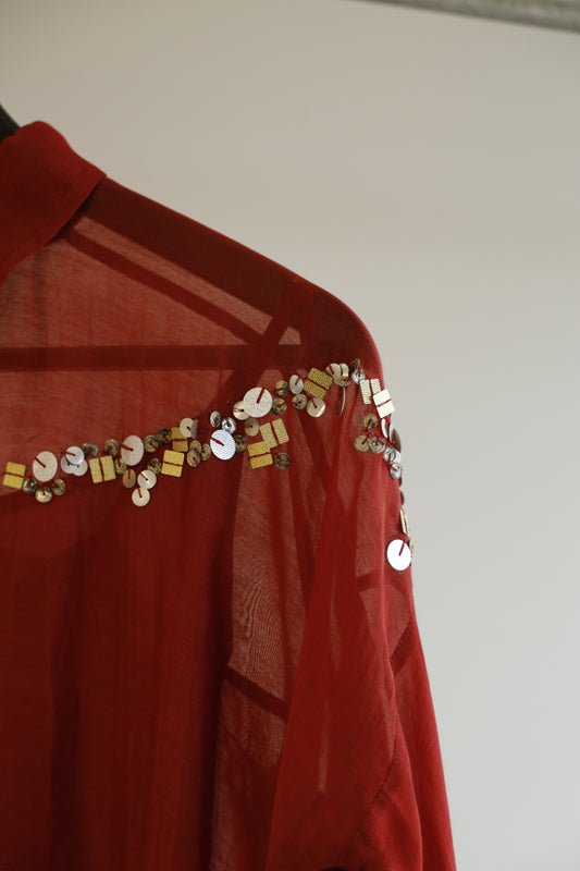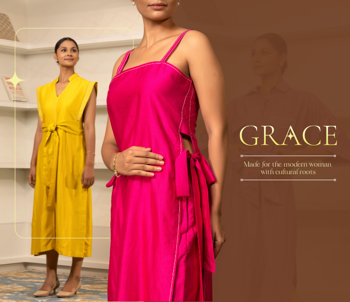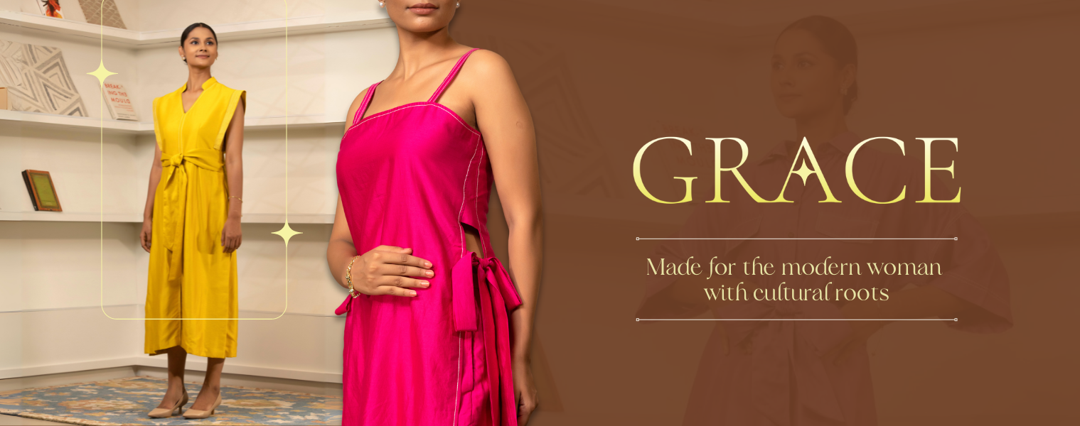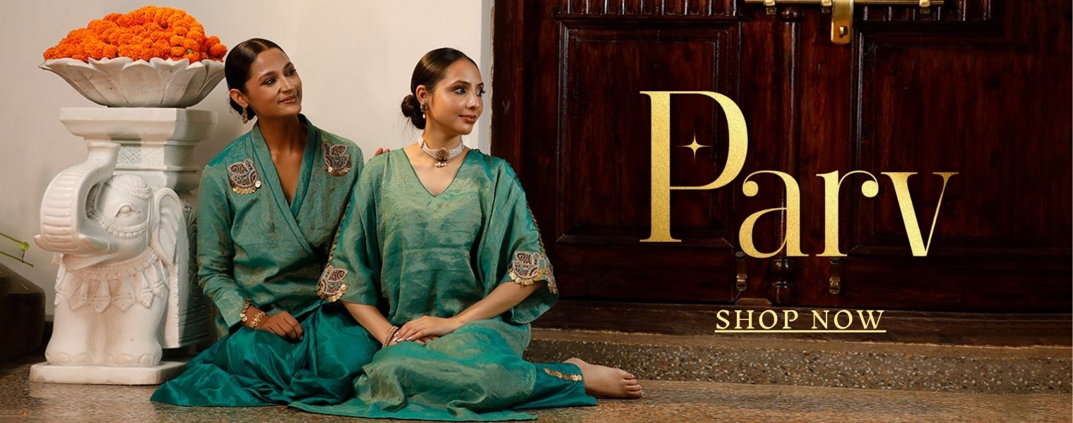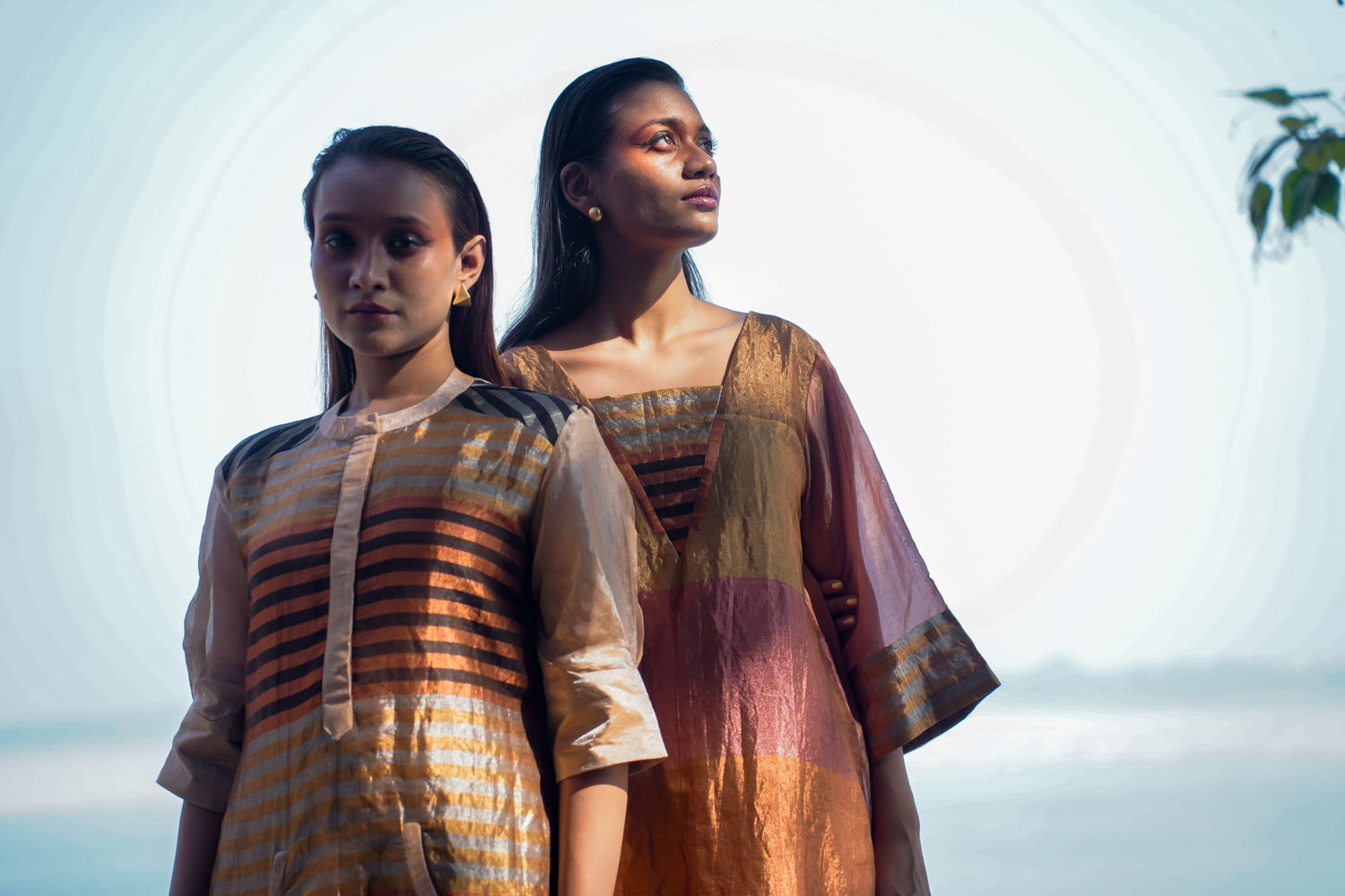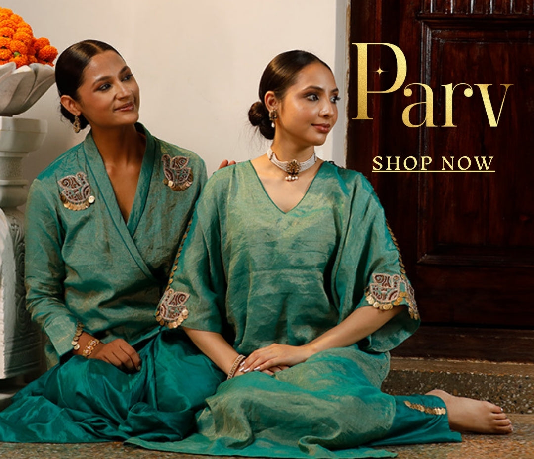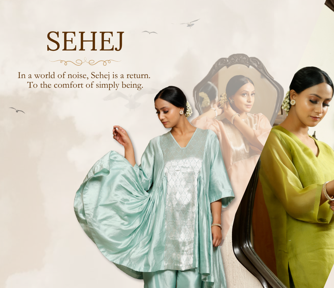 Explore EEDA's design philosophy where the timeless allure of Benaras fabric is sculpted into contemporary silhouettes for the modern woman.