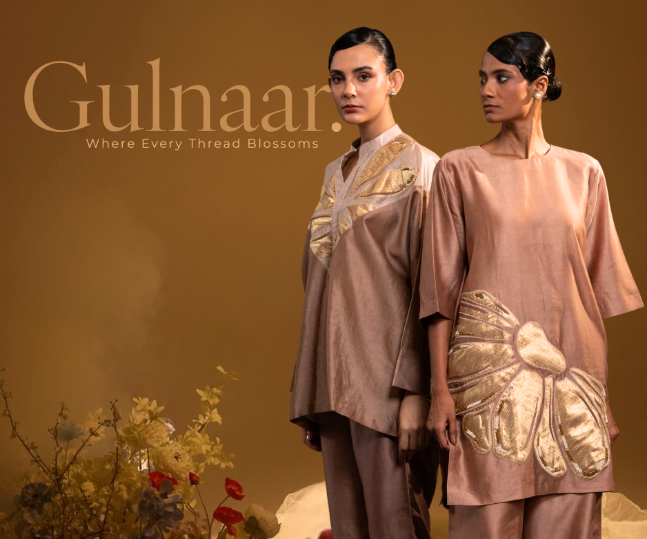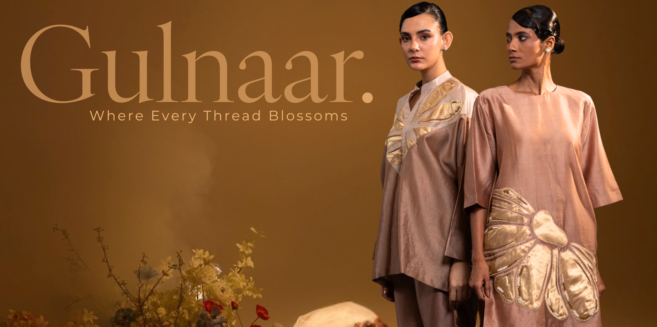 Explore EEDA's design philosophy where the timeless allure of Benaras fabric is sculpted into contemporary silhouettes for the modern woman.
