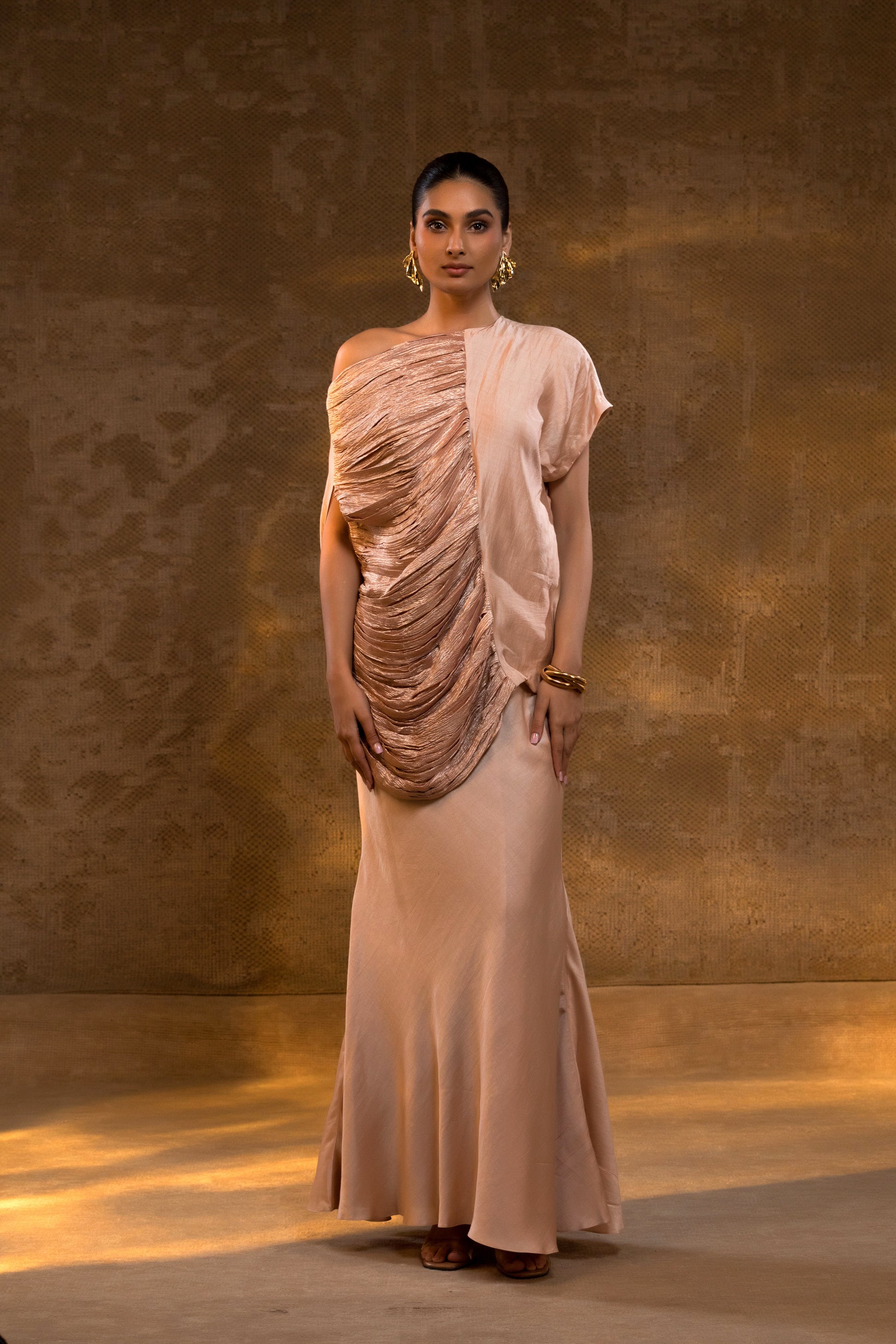 A blush one-shoulder draped skirt set in silk, handcrafted in Benaras. A refined Indo-Western ensemble for festive evenings and formal occasions.