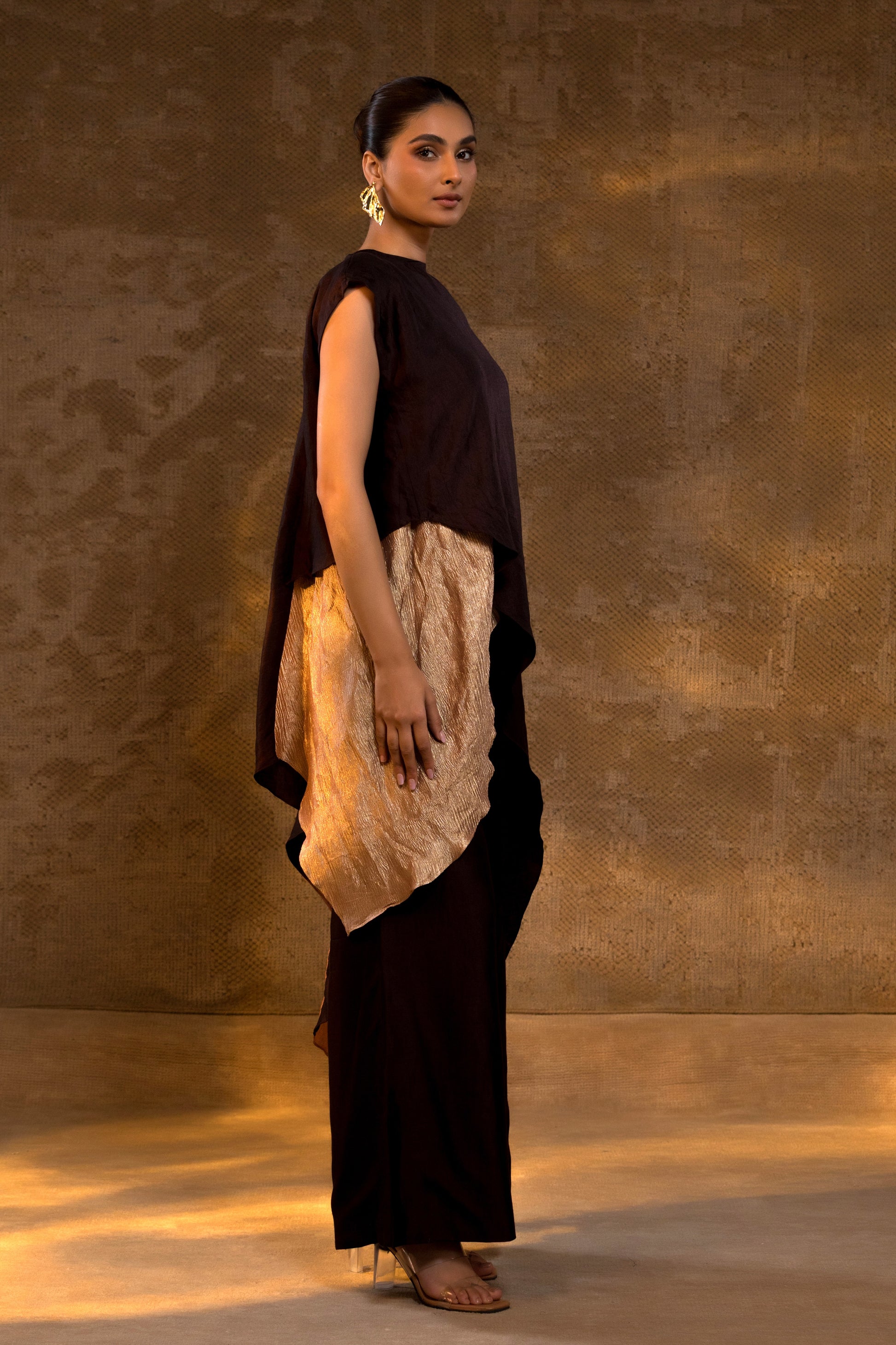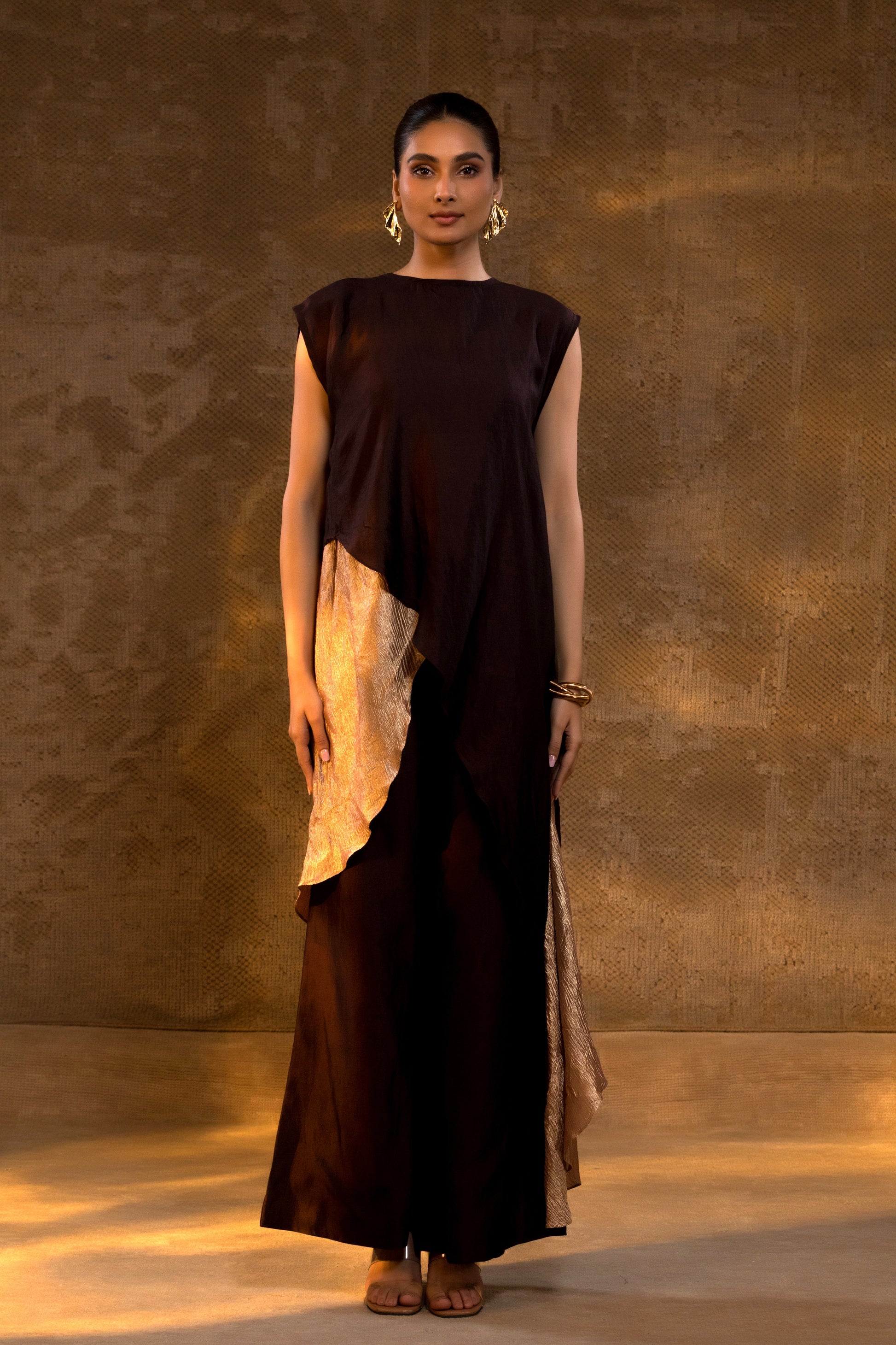 This layered kurta set pairs fluid silk with a molten gold–textured accent, creating a silhouette that feels quietly powerful yet deeply elegant. The play of matte and metallic lends depth without excess, making it ideal for women who favour understated luxury.