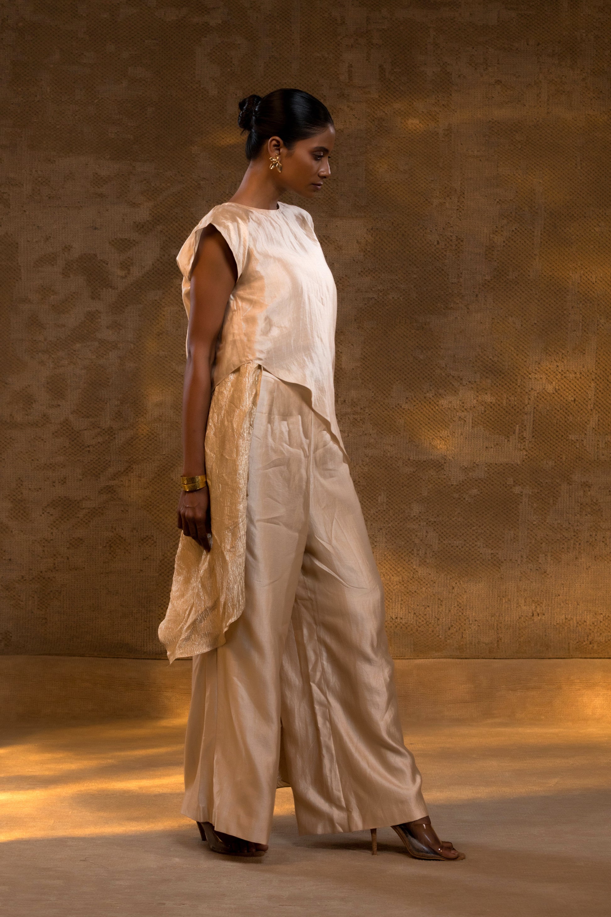 This layered coord set brings together fluid silk and a gentle metallic sheen in a structured yet effortless silhouette. The layered top creates movement and dimension, while the wide pants keep the look relaxed and contemporary.