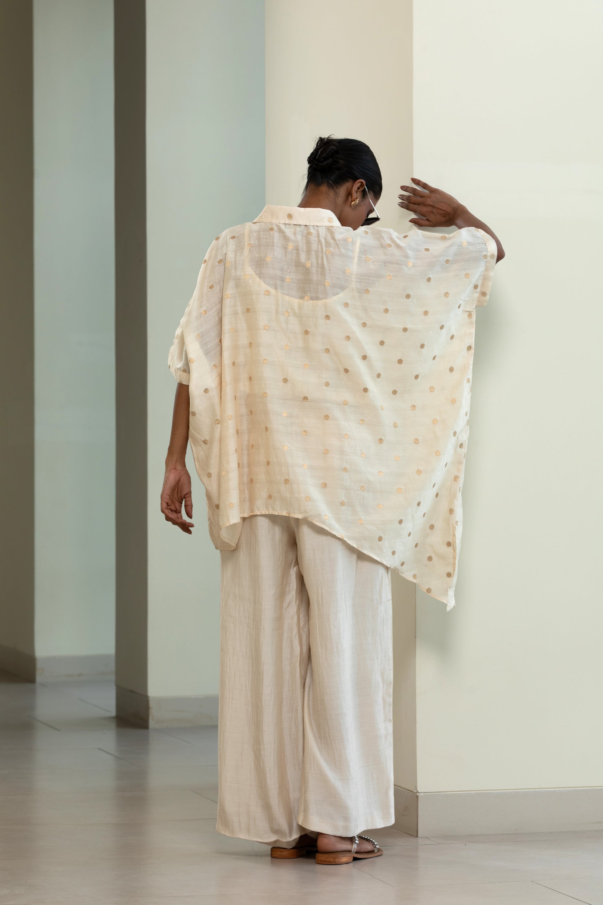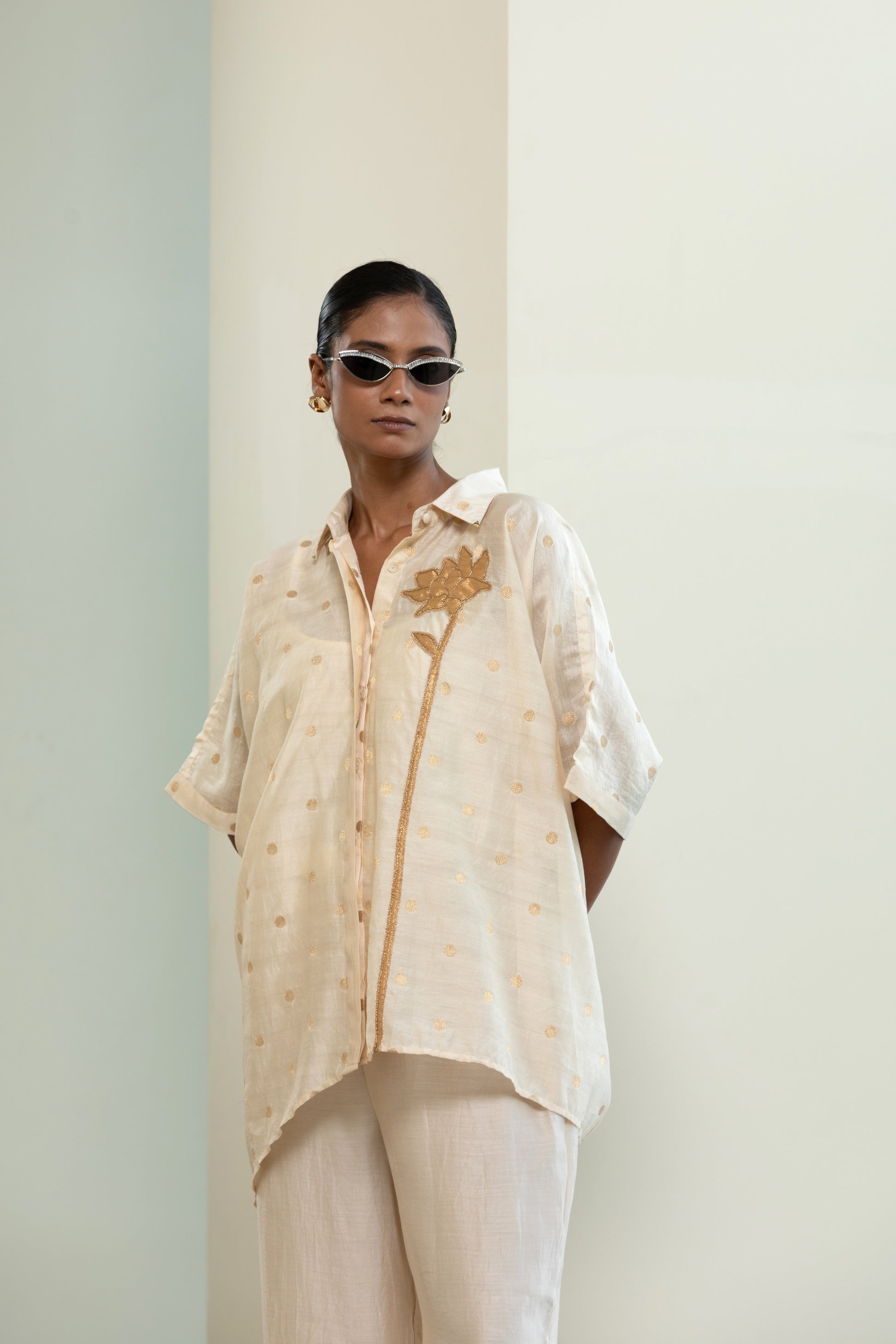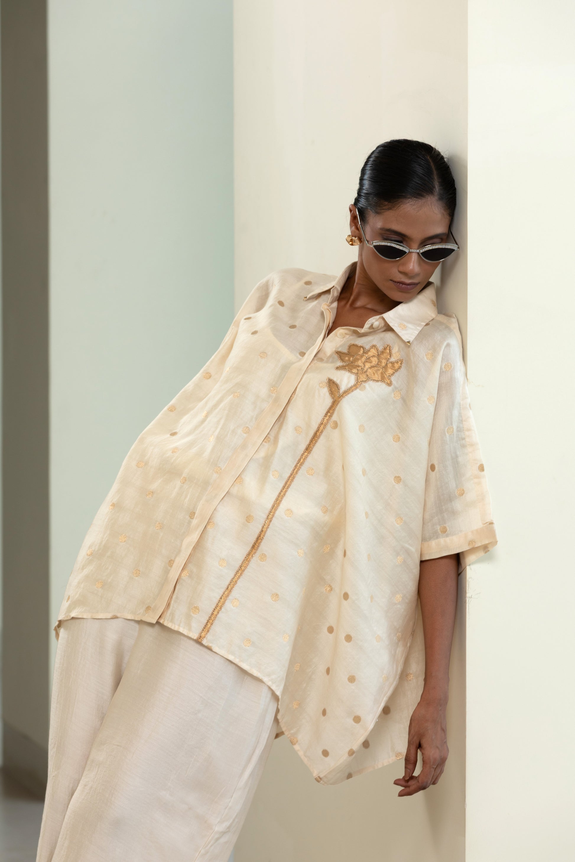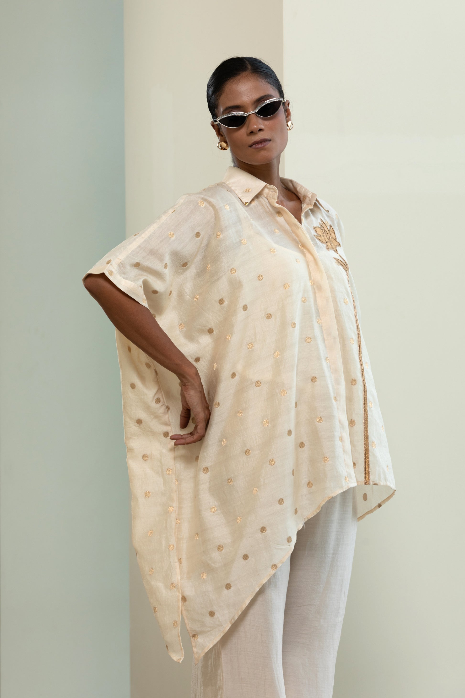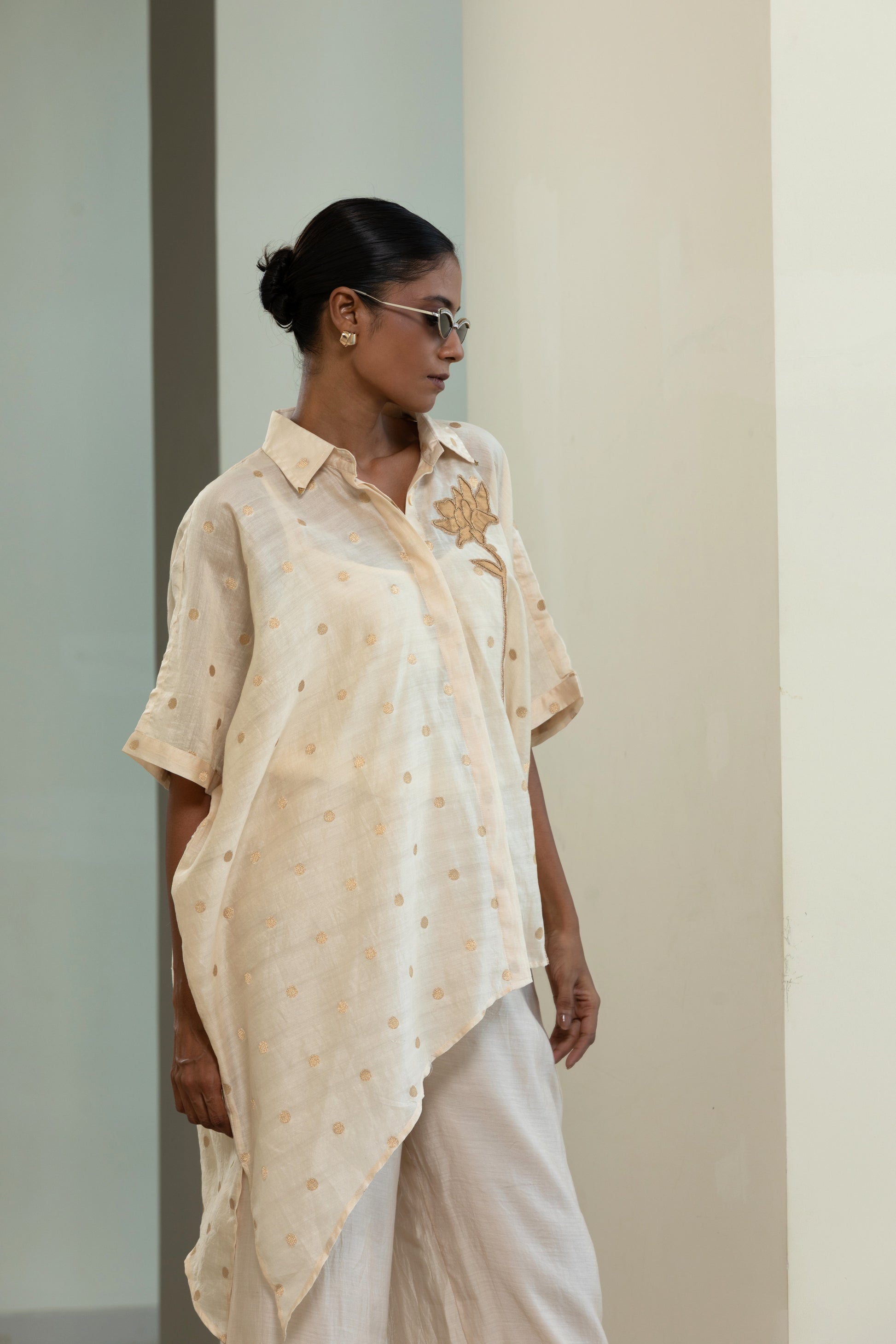 Elevate your everyday wardrobe with our Asymmetrical Silk Shirt, a modern take on effortless luxury. Crafted from pure silk, this flowy and breathable piece drapes beautifully, offering a relaxed yet polished look.
