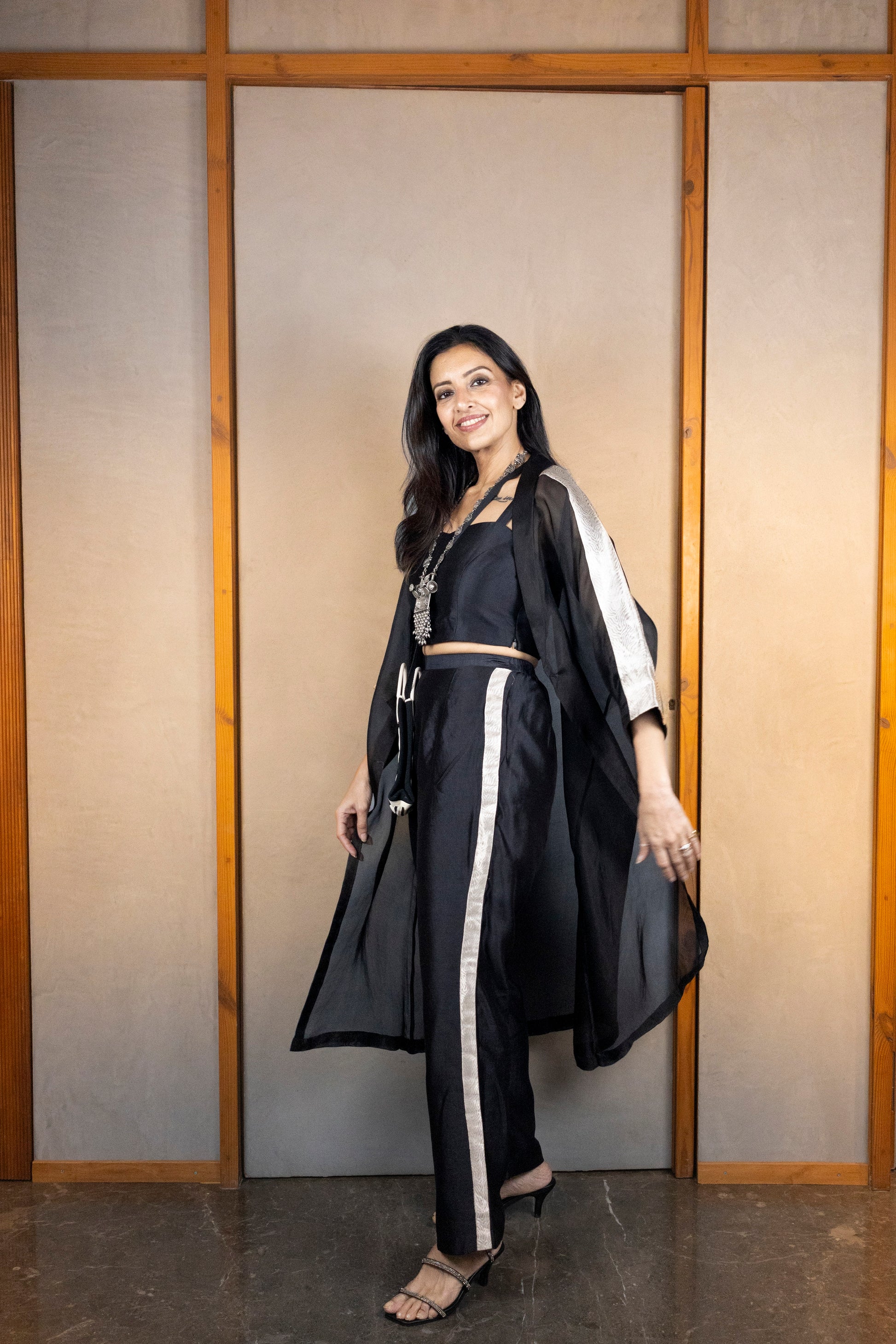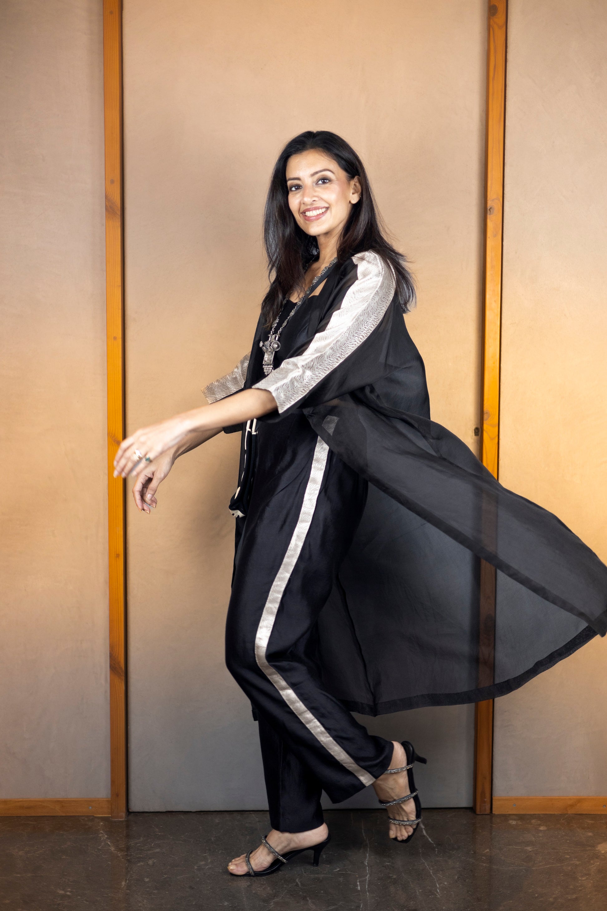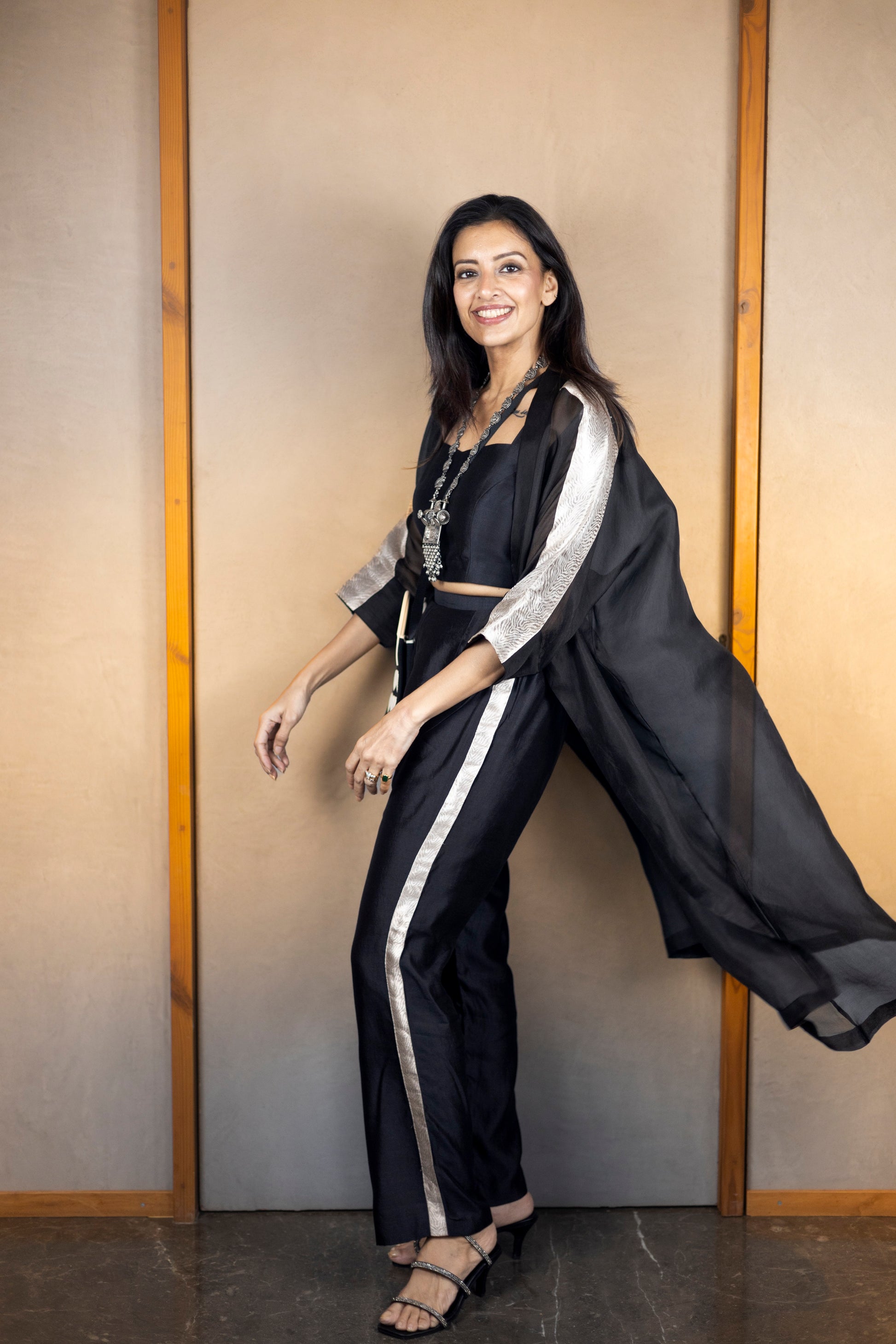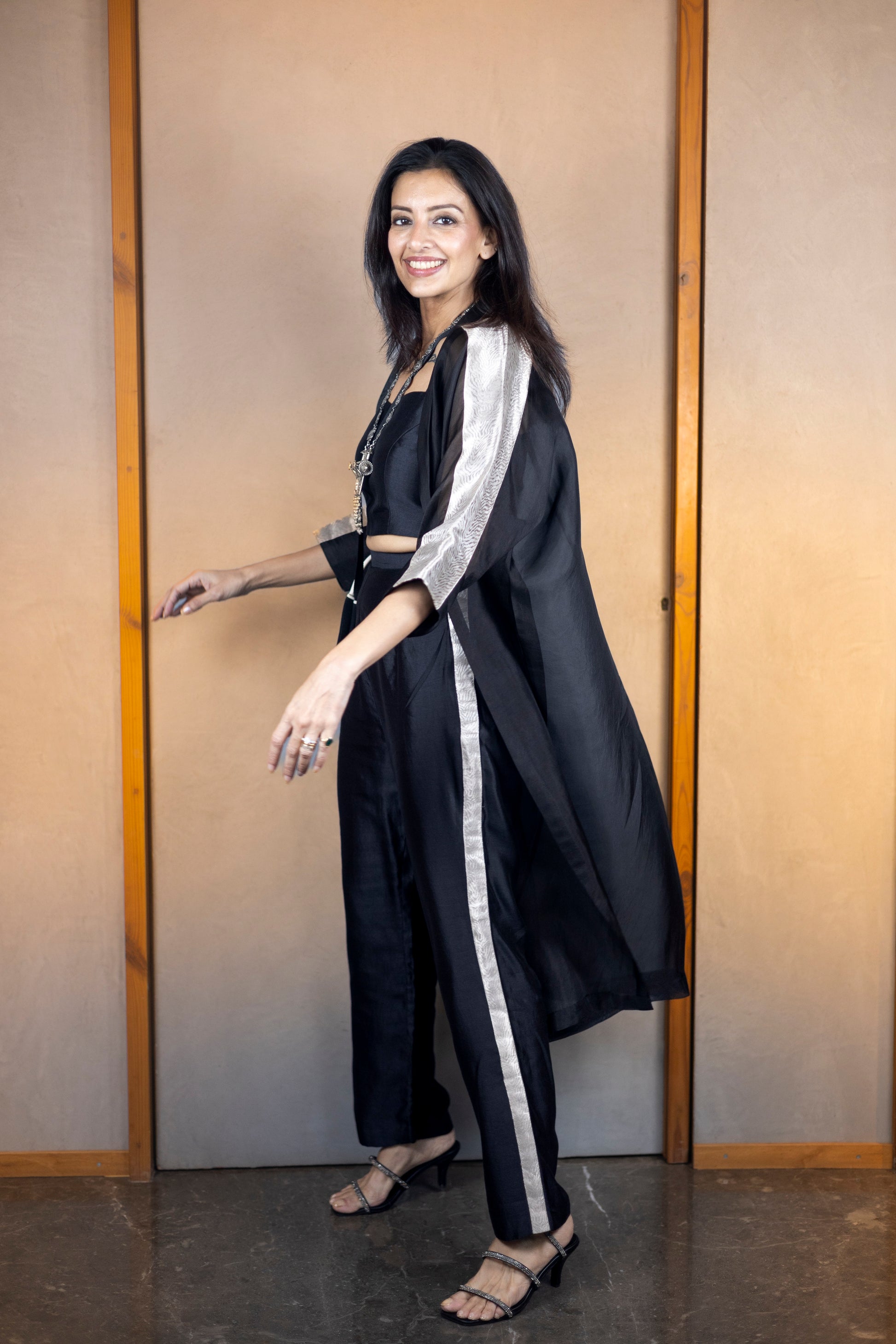 The set features a long collared silk tissue overlay jacket, distinguished by its below-elbow-length sleeves adorned with golden patching, adding an element of refined elegance.