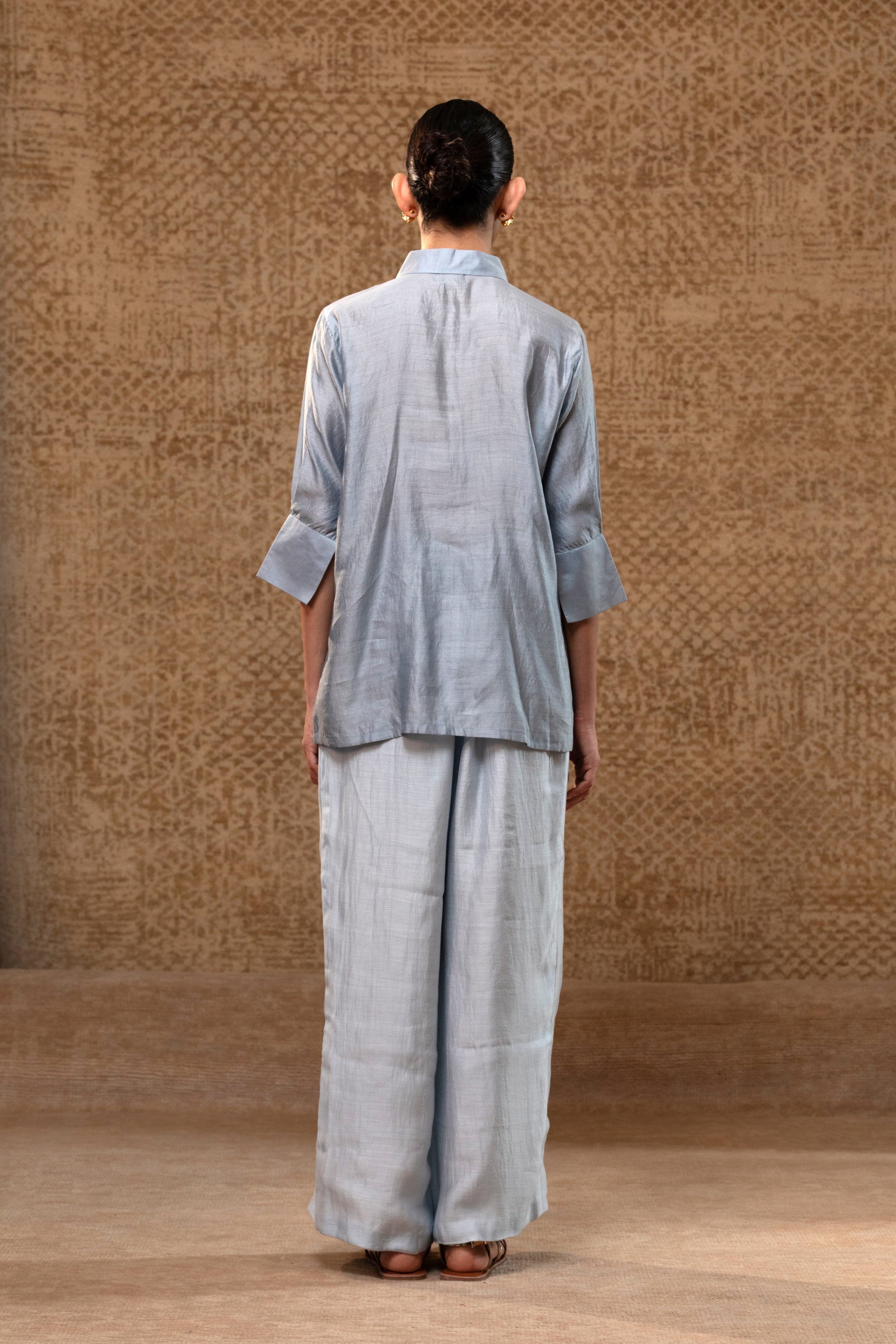 A tailored silk shirt elevated with hand-embroidered diamond-shaped metallic patchwork. Designed for understated glamour, it blends structure with fluidity — making it a timeless addition to your festive wardrobe.
