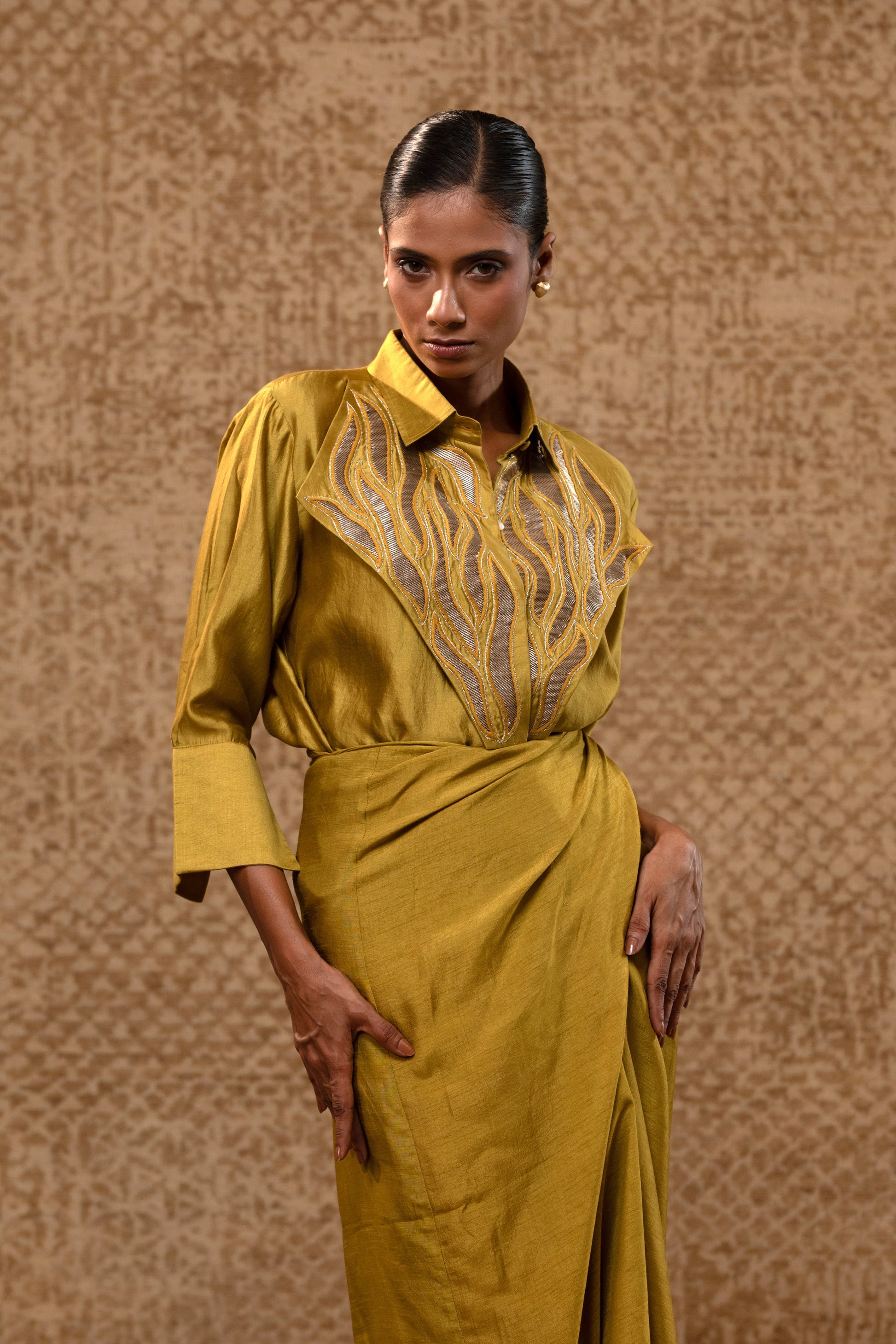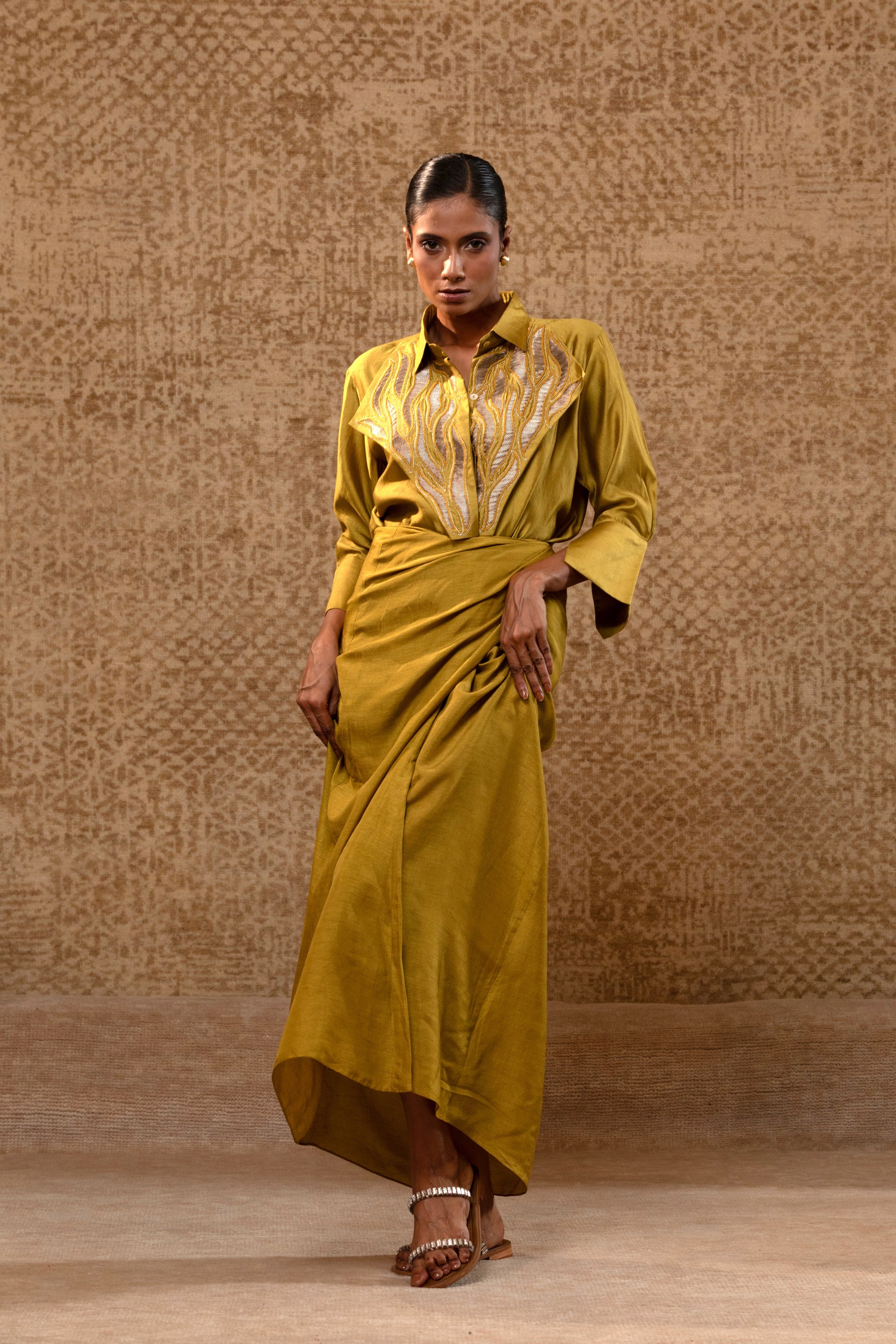 Crafted in luxurious silk, the relaxed-fit shirt is adorned with striking metallic embroidery — a contemporary take on traditional handwork. Styled with a wrap skirt for a sleek, powerful look.