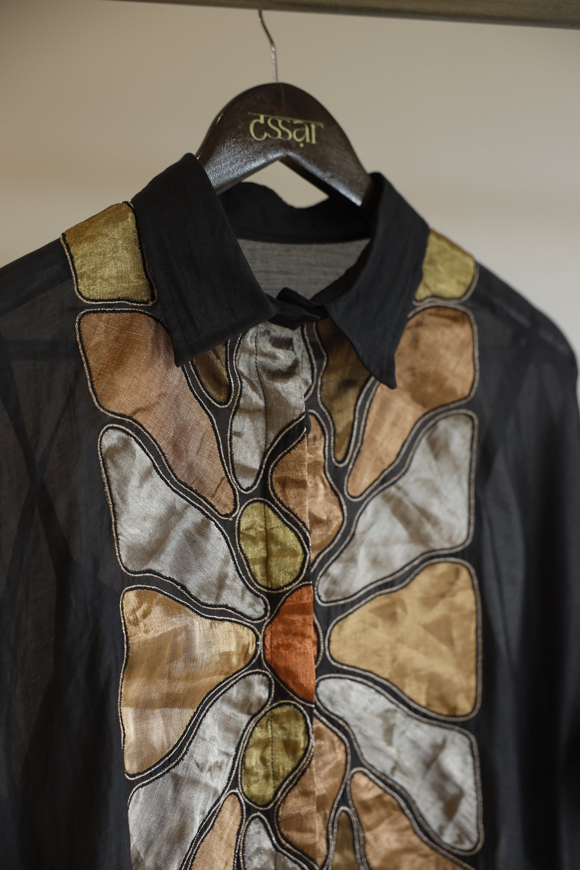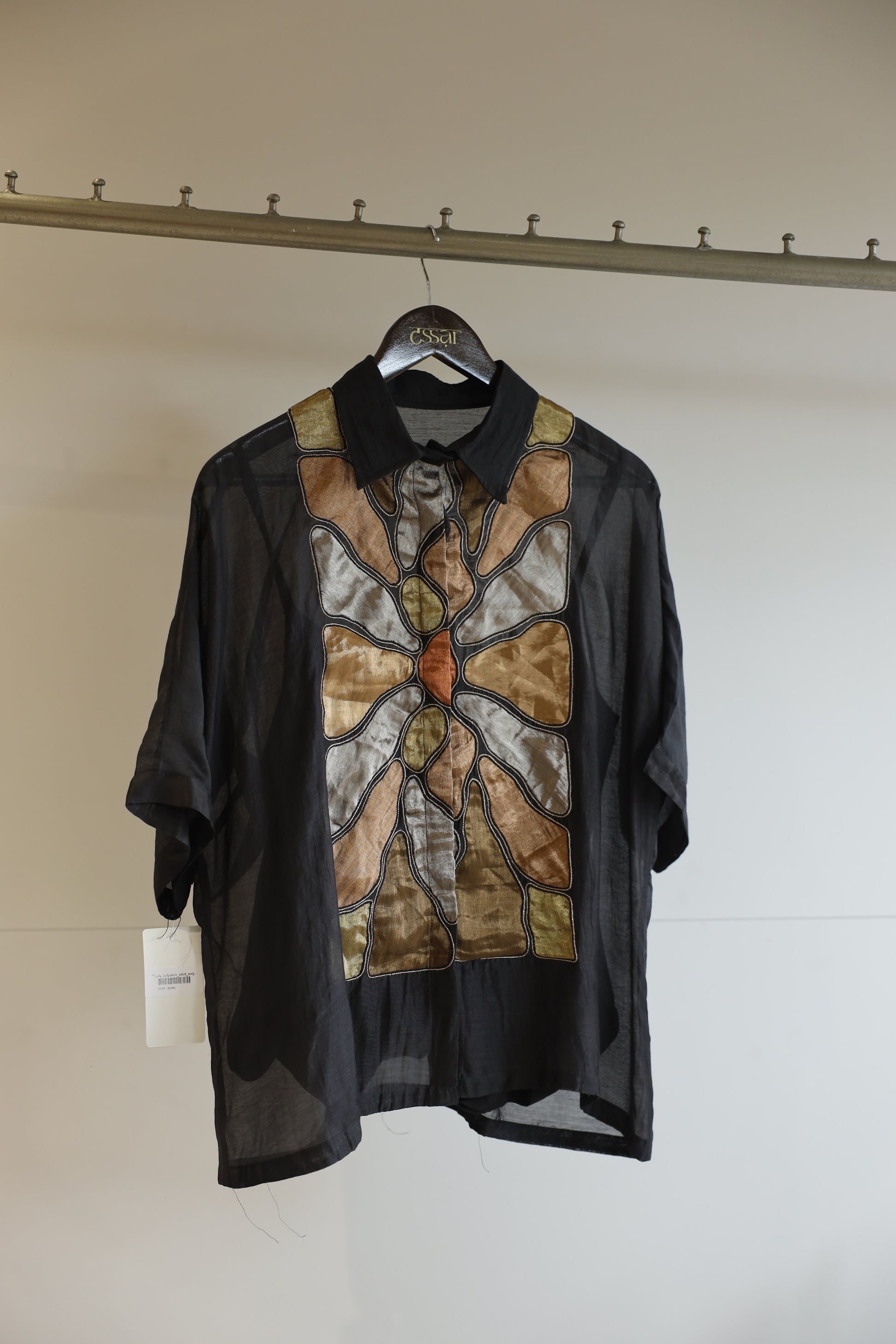 A relaxed-fit viscose silk shirt featuring intricate multicolour patchwork in tissue, placed in a bold geometric layout. Lightweight and lined, this shirt merges craftsmanship with comfort.