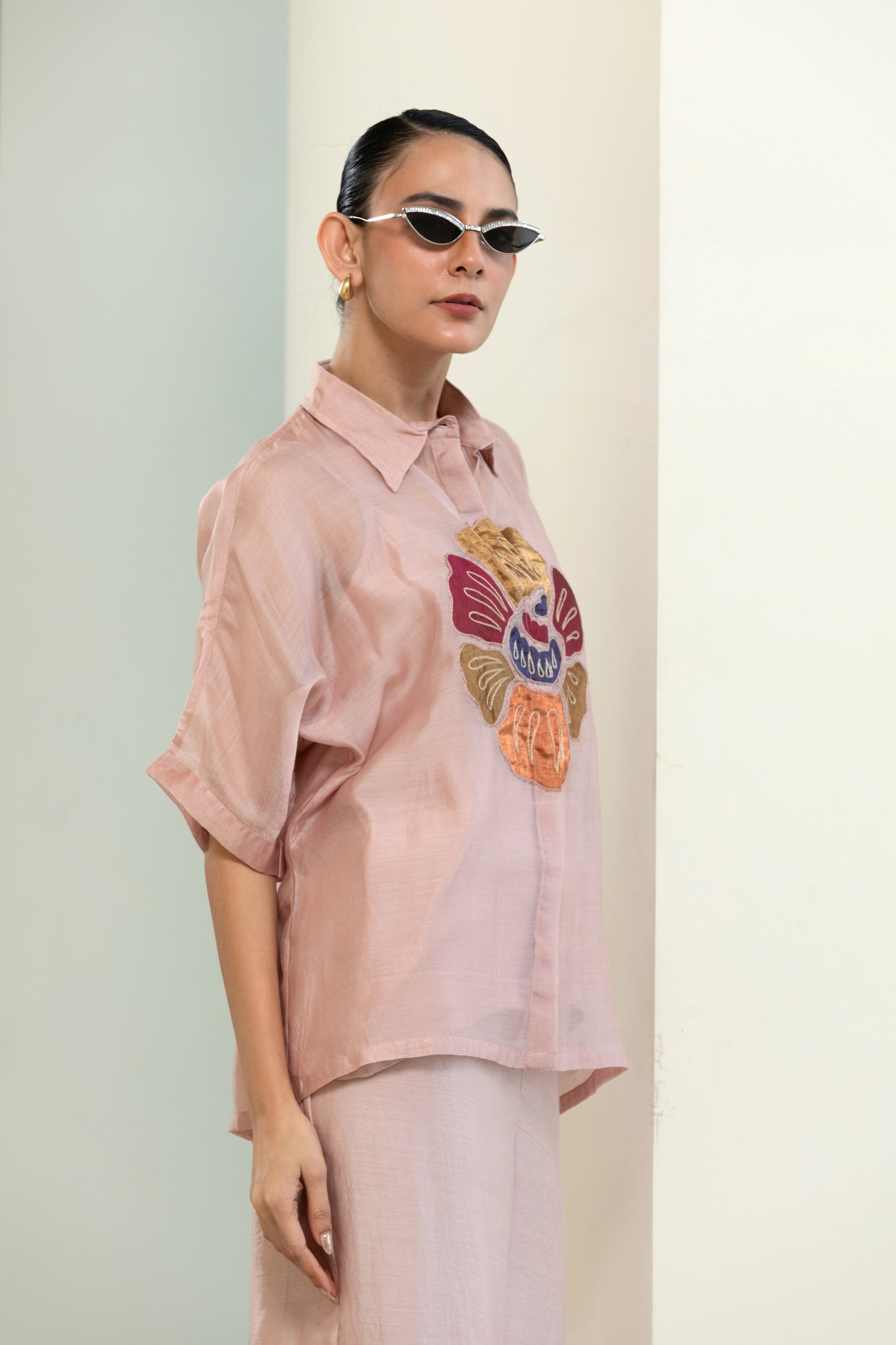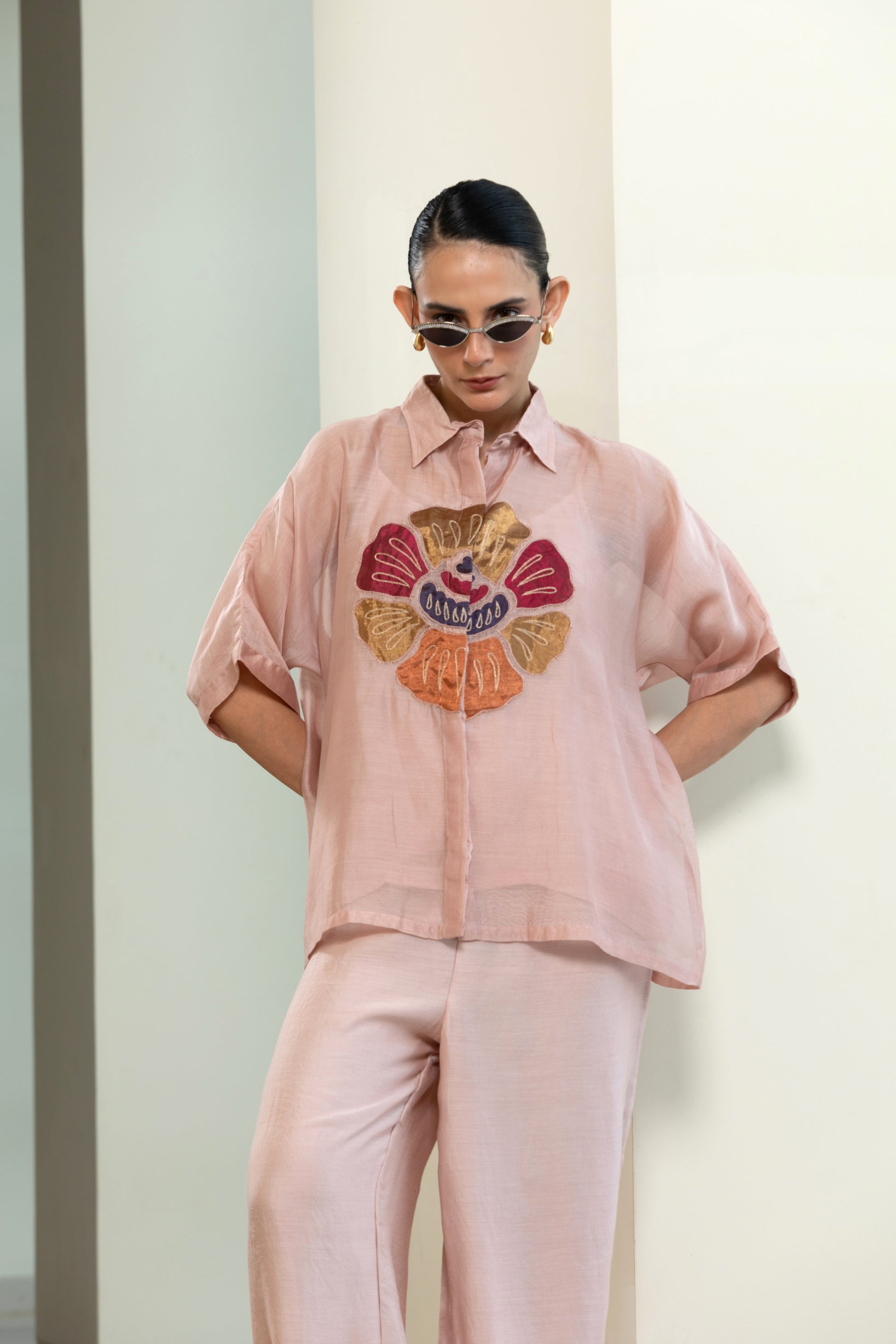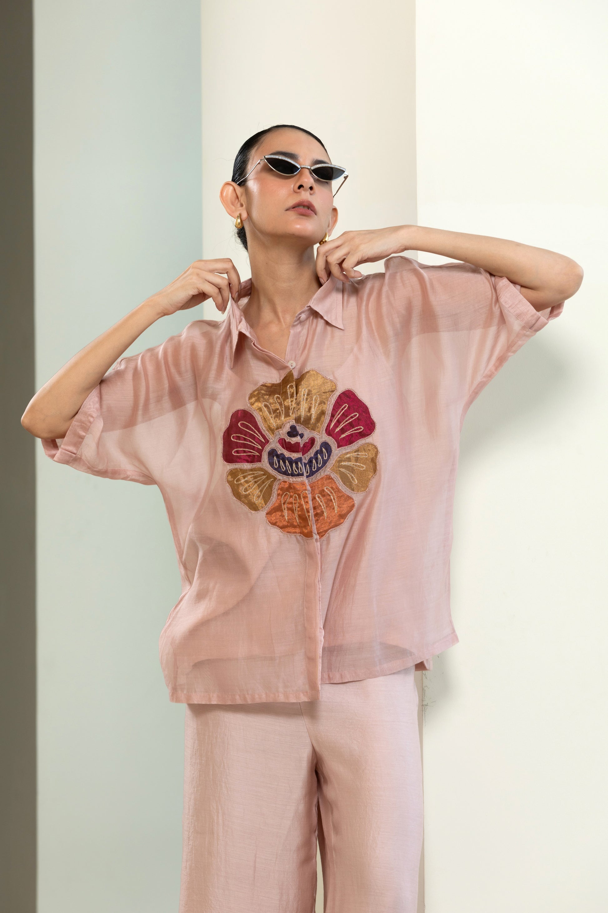 This relaxed-fit shirt is crafted in lightweight viscose silk and features a bold hand-patched floral motif on fine tissue. Comes with a matching inner.