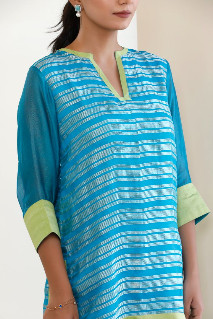 This elegant ensemble features a stylish high-low kurta paired with bootcut pants, creating a contemporary look. The kurta falls just above the knee and is designed with a relaxed fit. The front of the kurta is adorned with a deep cut-V neck, adding a modern flair to the silhouette. The bootcut pants extend below the ankle, offering a sleek and elongated appearance. An elasticized waistband at the center back ensures a snug yet comfortable fit.