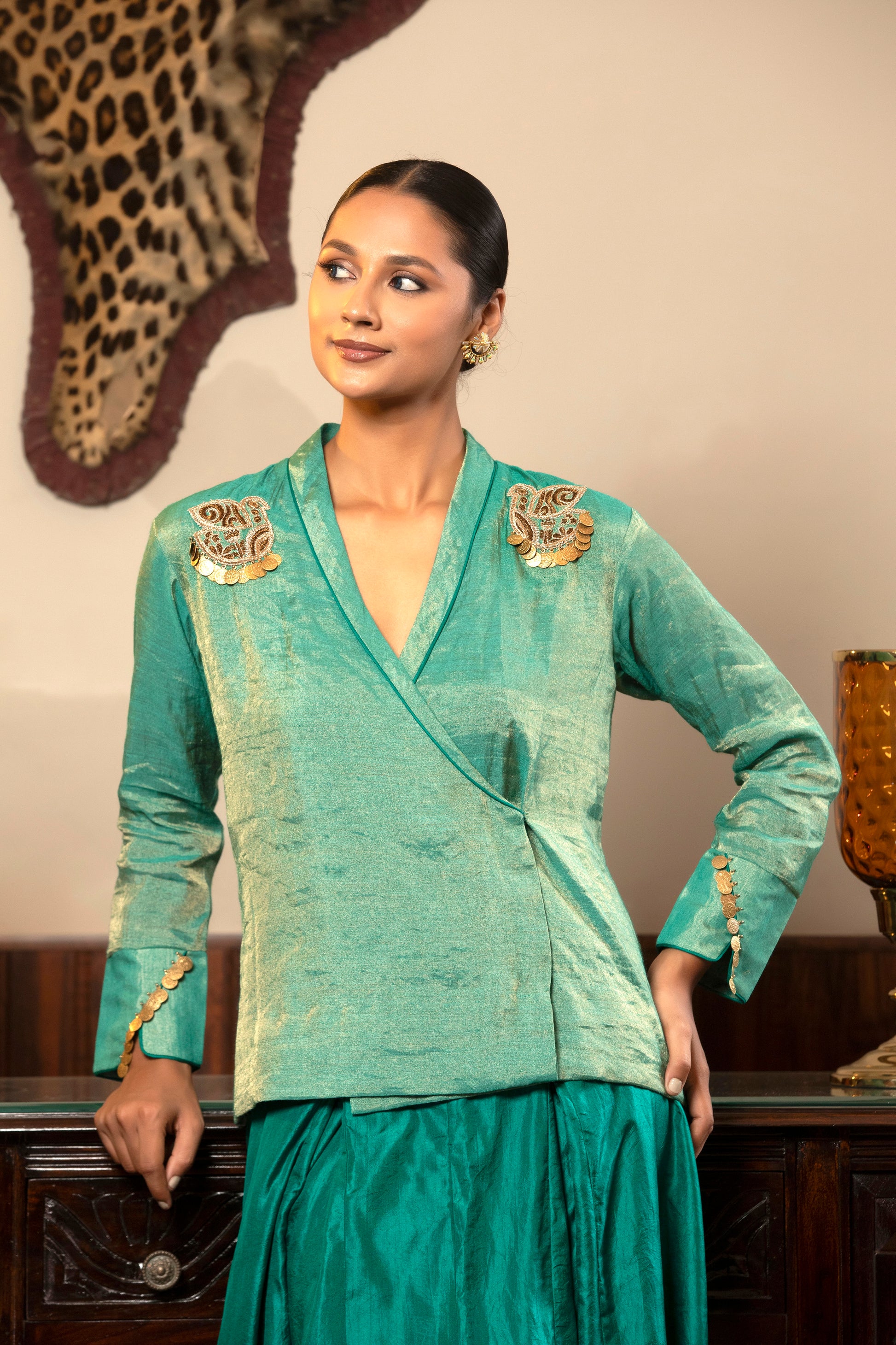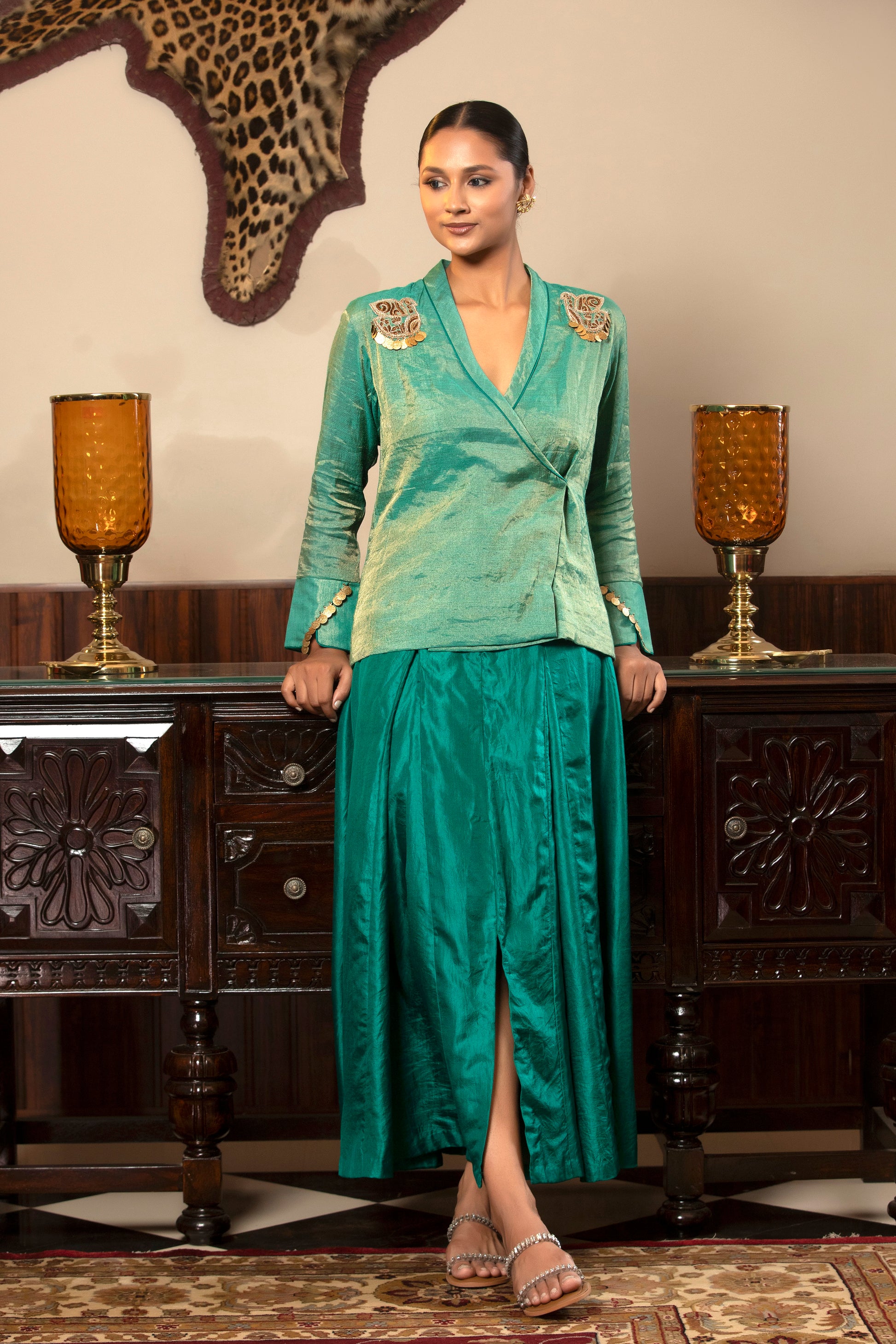 The Parv Green Skirt Set blends effortless style with timeless elegance, perfect for the modern woman with a flair for tradition. The relaxed-fit, short-length shirt features a chic collar and a front overlap design, offering a contemporary twist to a classic silhouette.