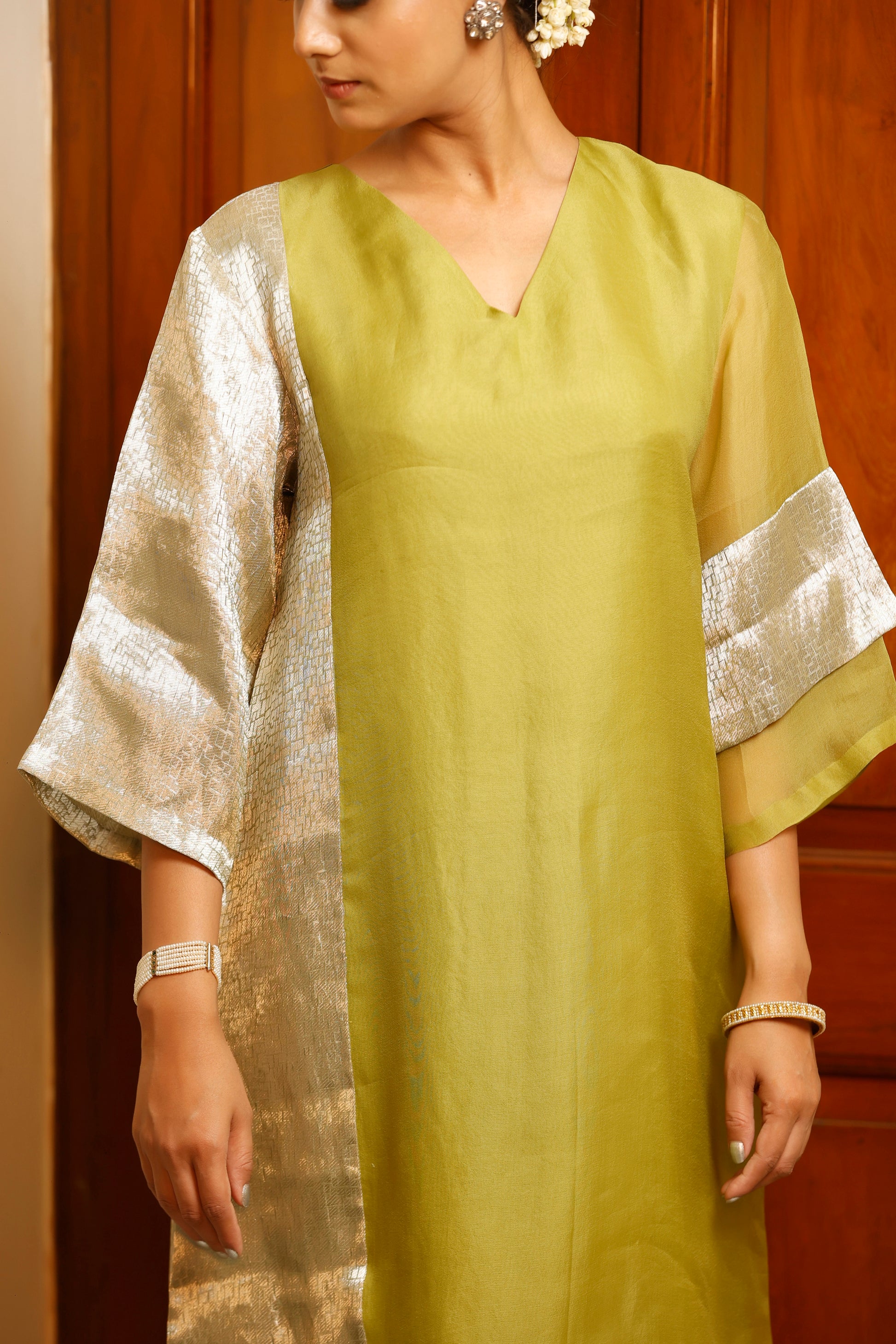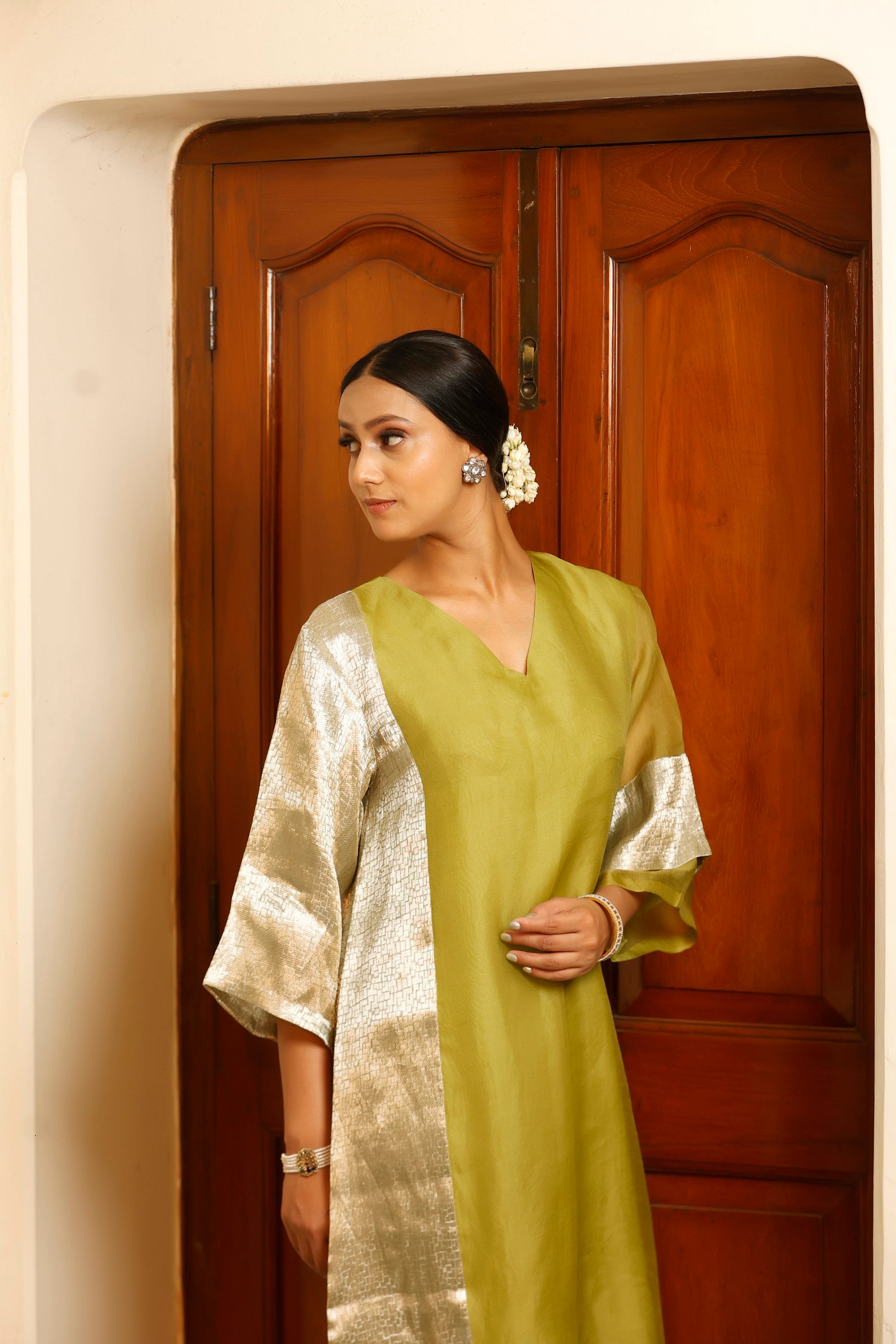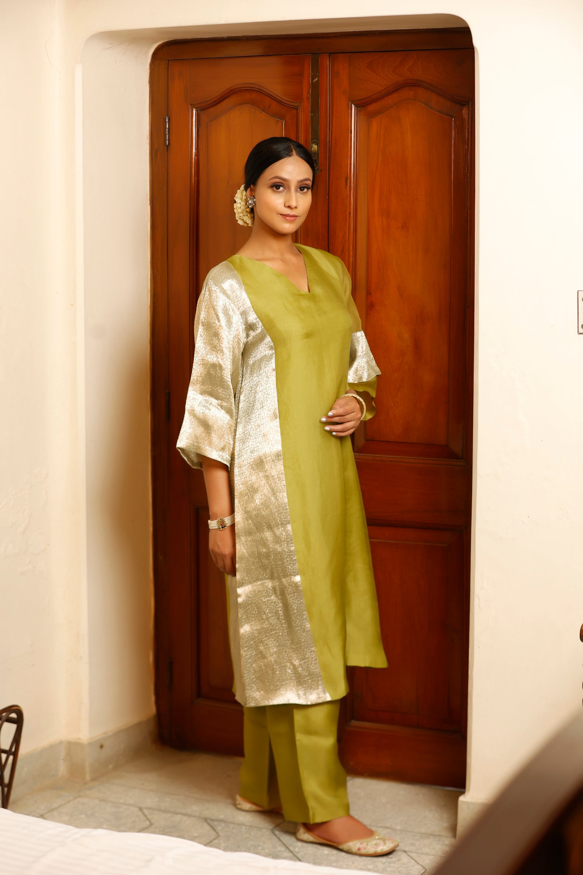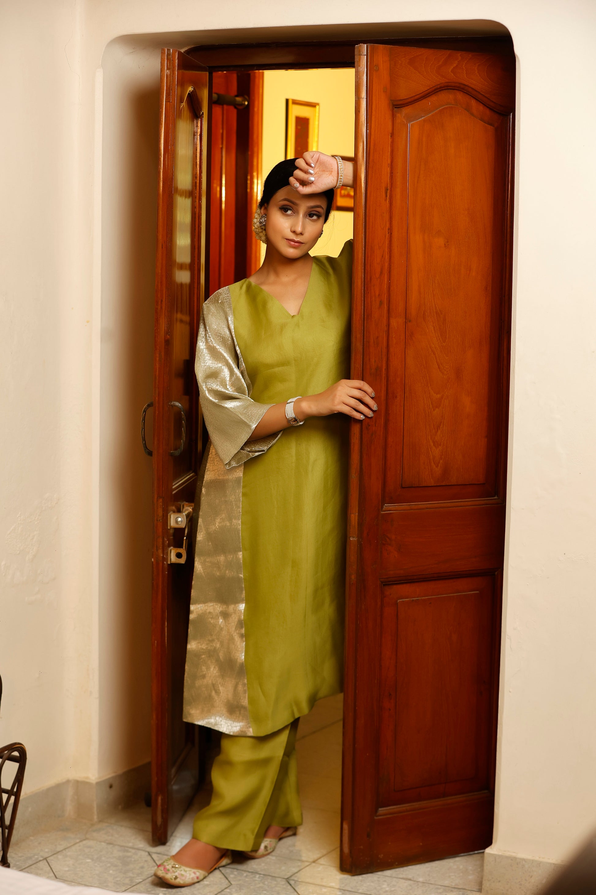 A straight, calf-length kurta with a V neckline and curvy elbow-length sleeves, paired with ankle-length straight pants. The relaxed fit and thoughtful cut make it a go-to for all-day elegance.