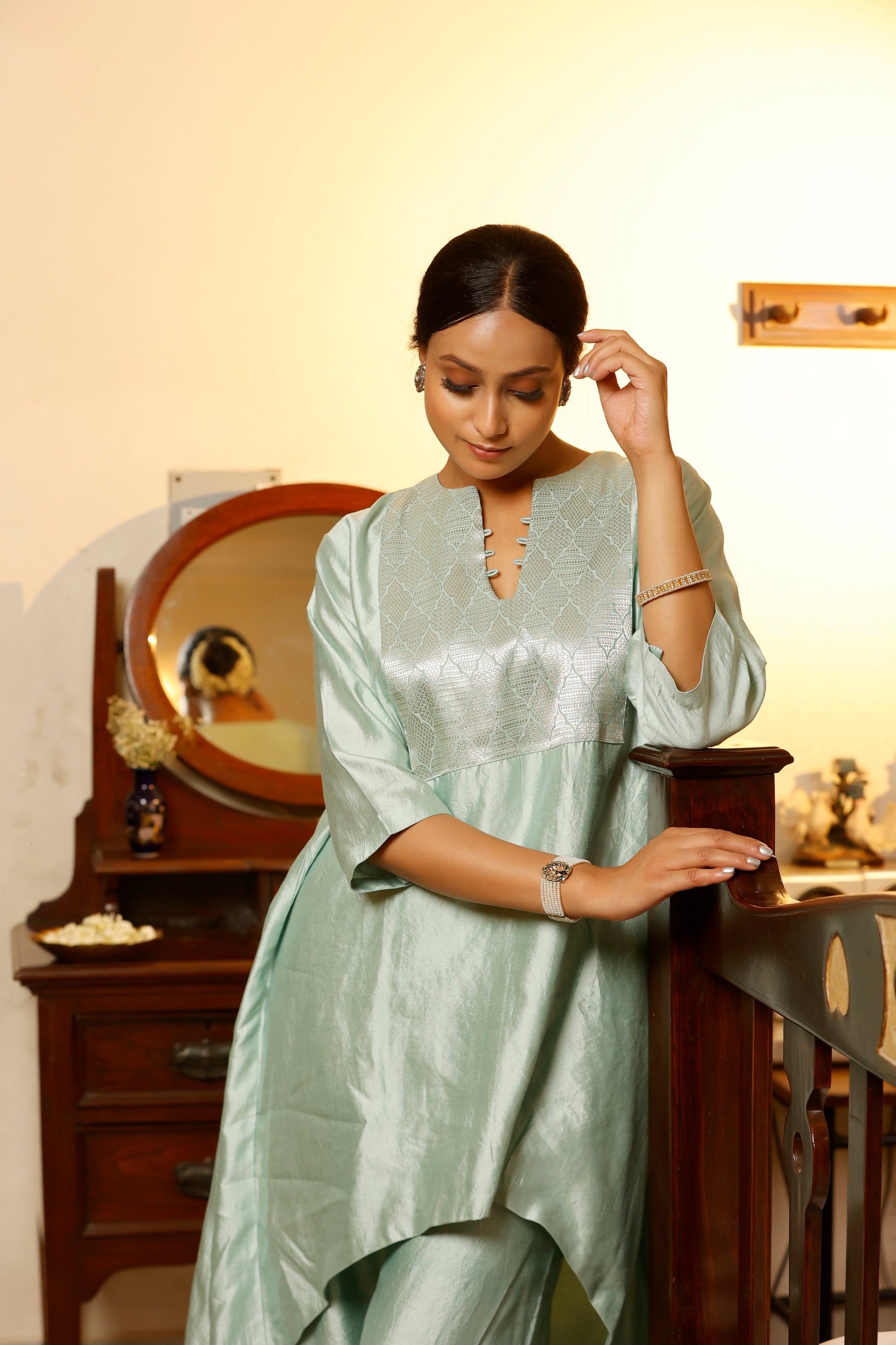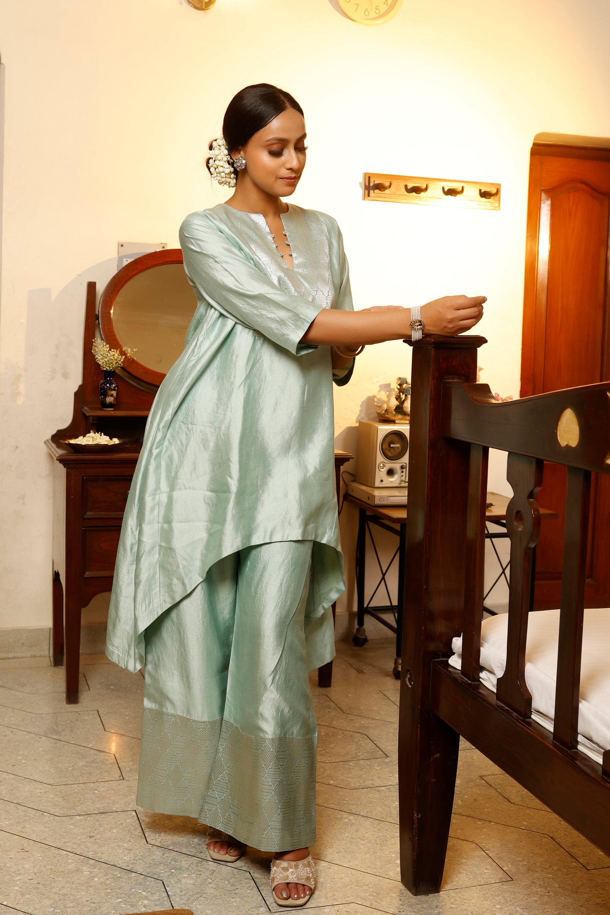 A high-low kurta with a V-neckline in front and a rounded neck at the back, finished with a statement patch. Paired with wide-legged pants featuring a matching patch and an elasticated waistband — crafted for movement, anchored in ease.