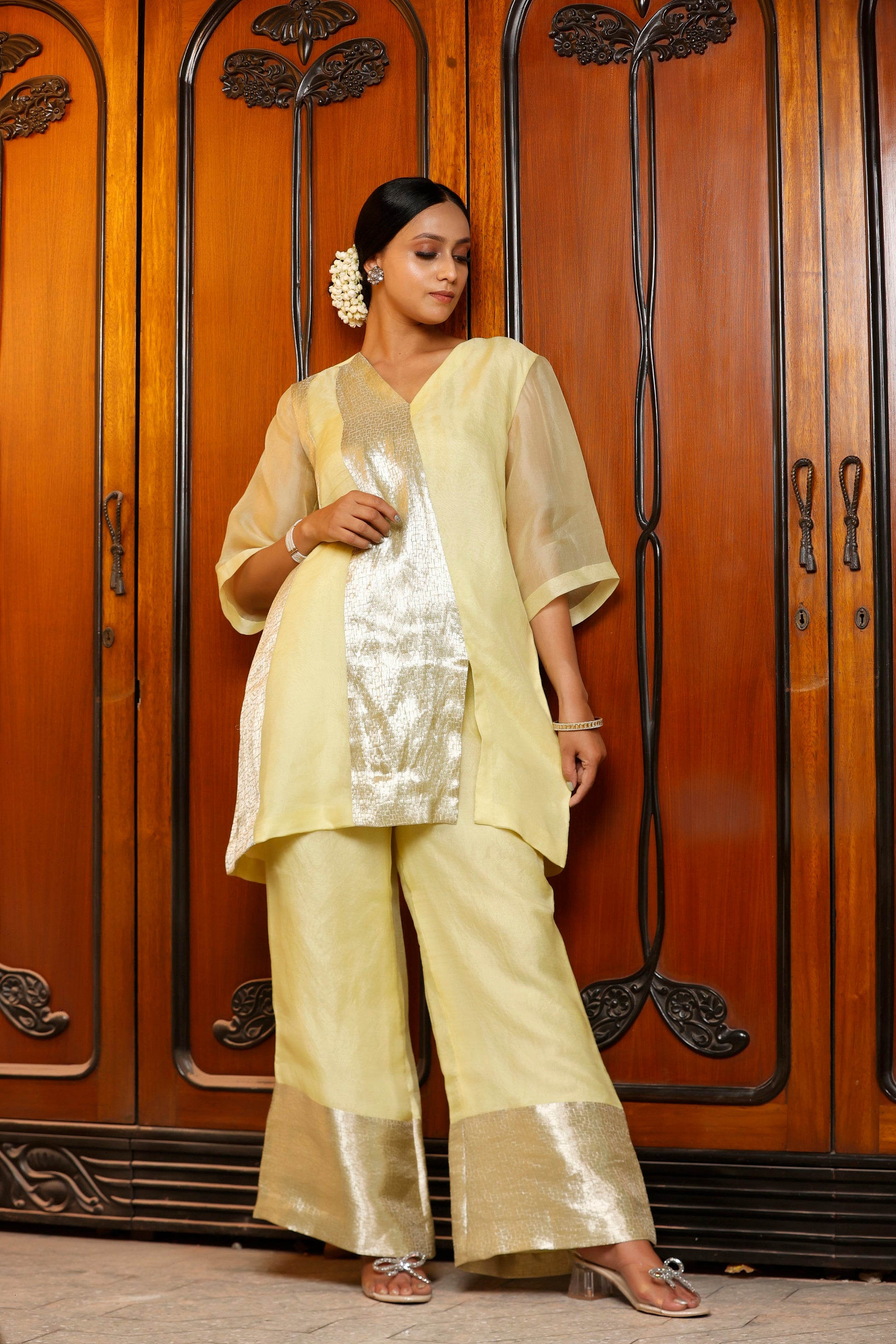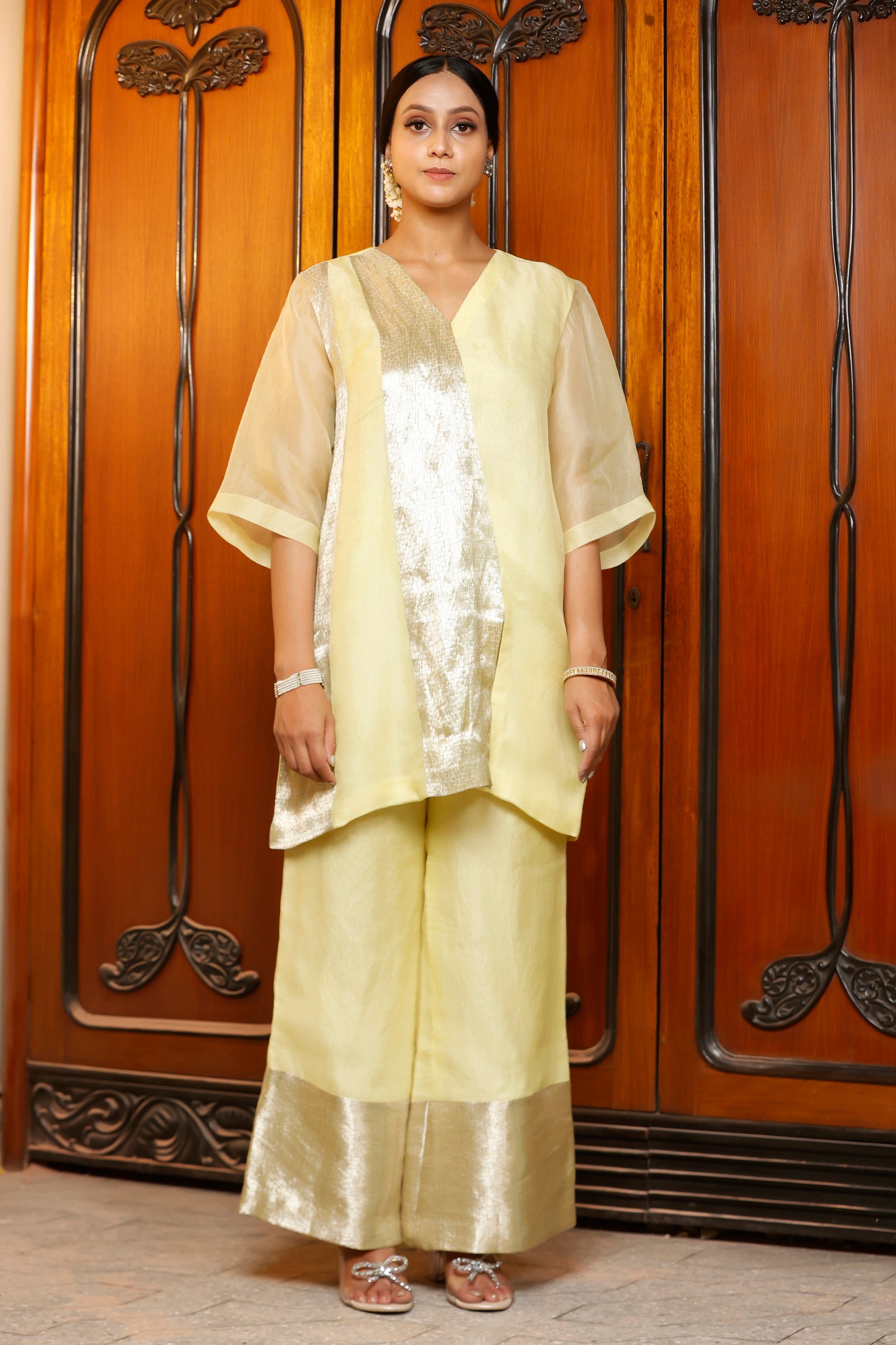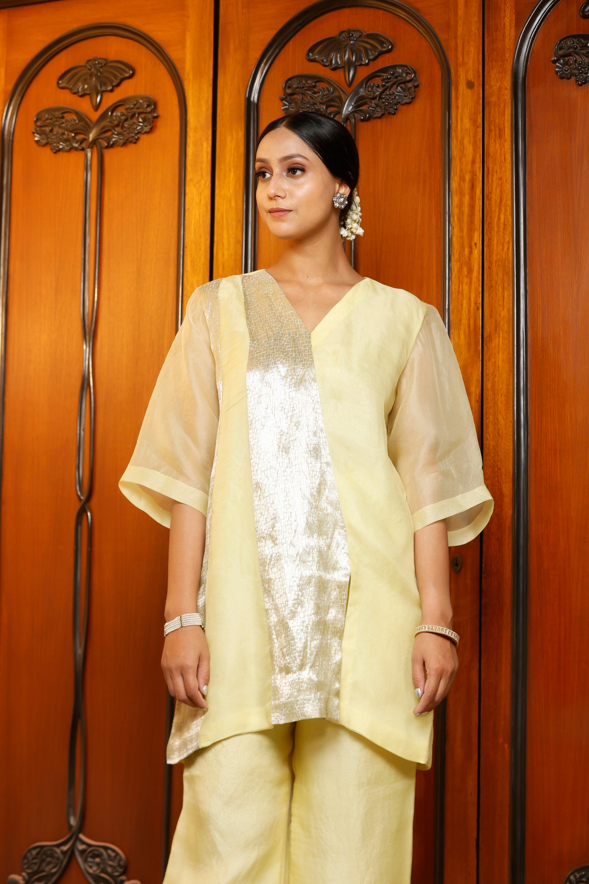 A short organza kurta with a silver patch, paired with high-waisted wide-leg pants in matching organza. Minimal, weightless, and made for slow, intentional days.