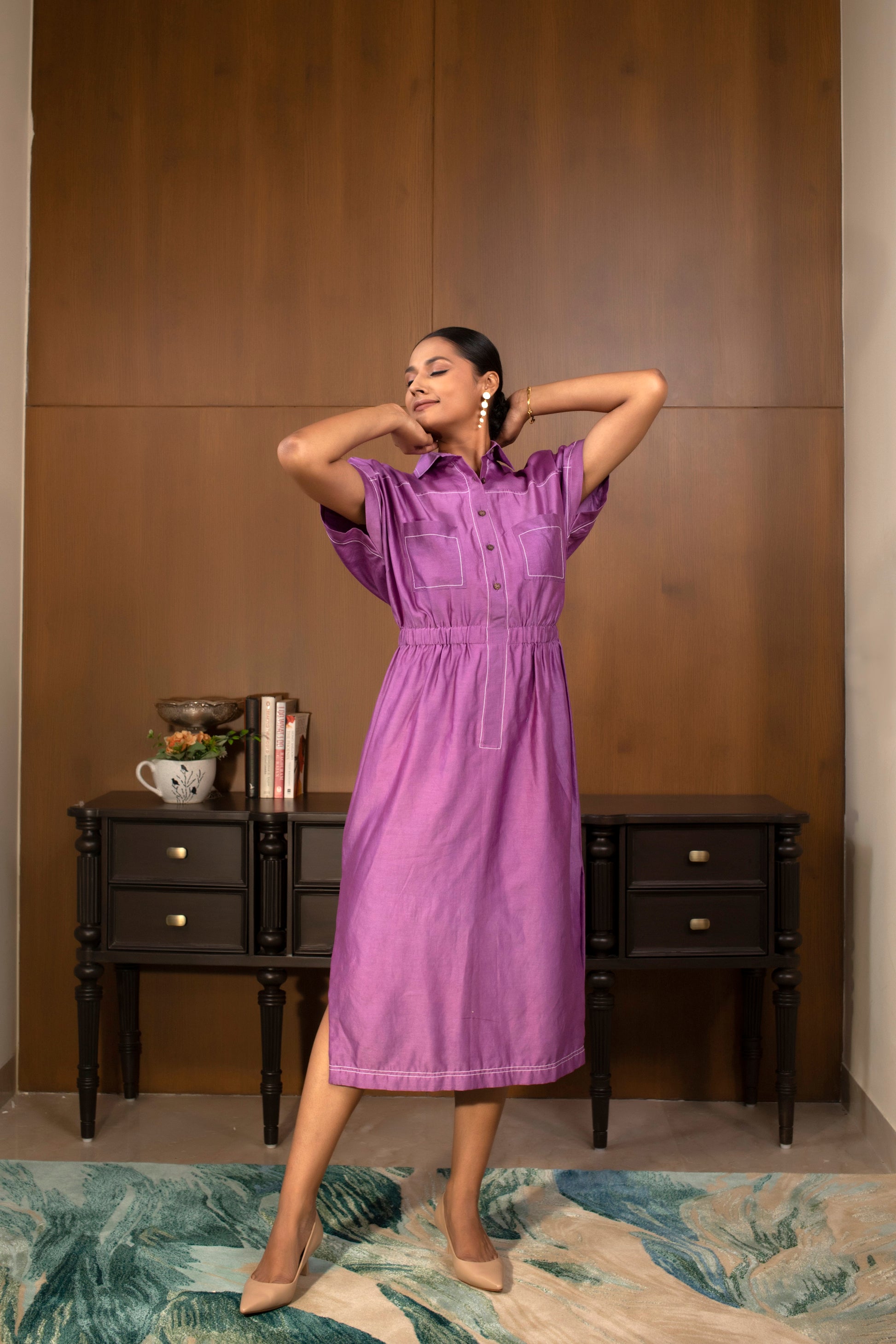 A collared ankle-length dress with a patch detail on the front and back. The dropped shoulders and elasticated waist provide a straight, boxy fit, complemented by side slits.