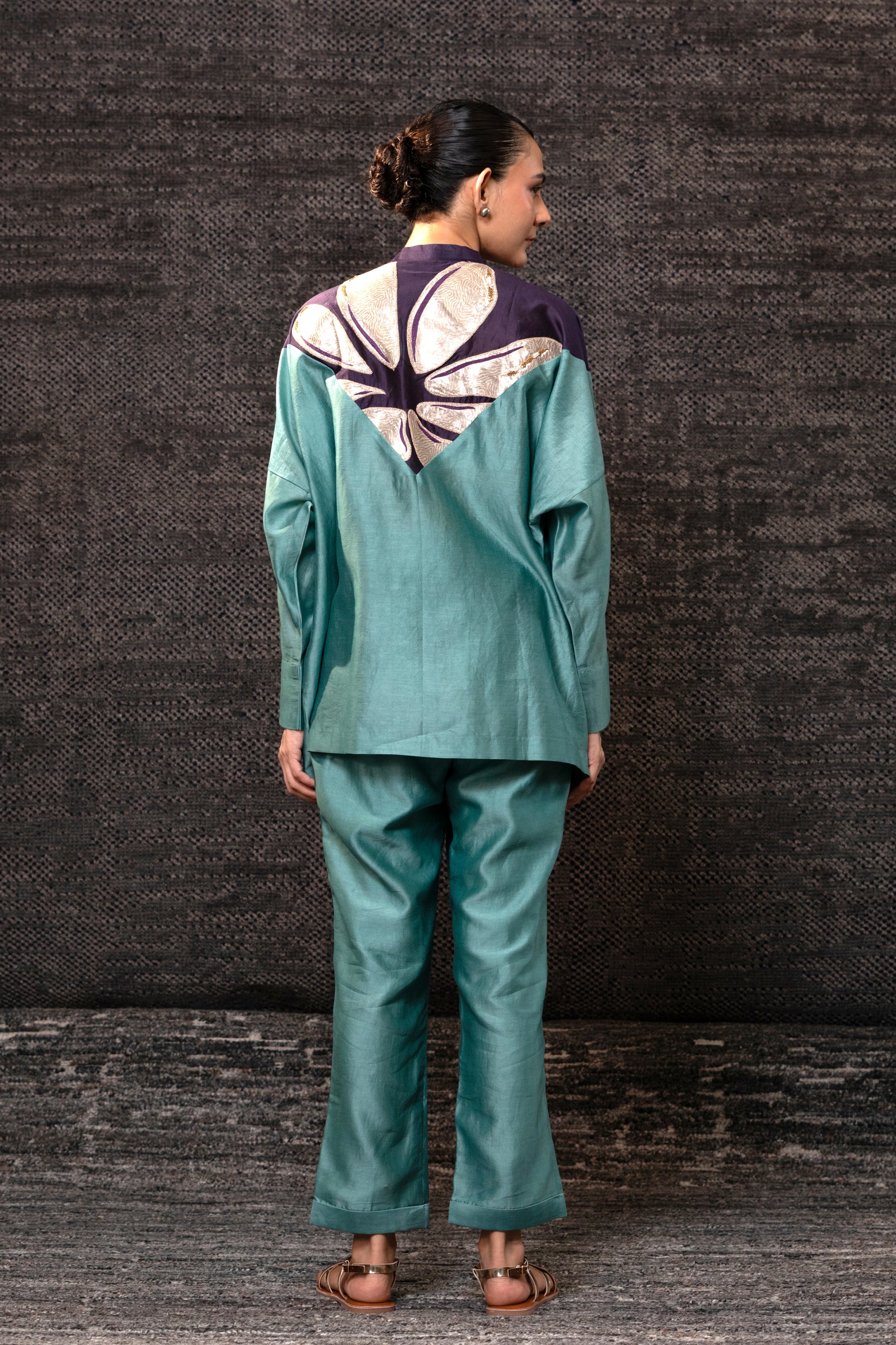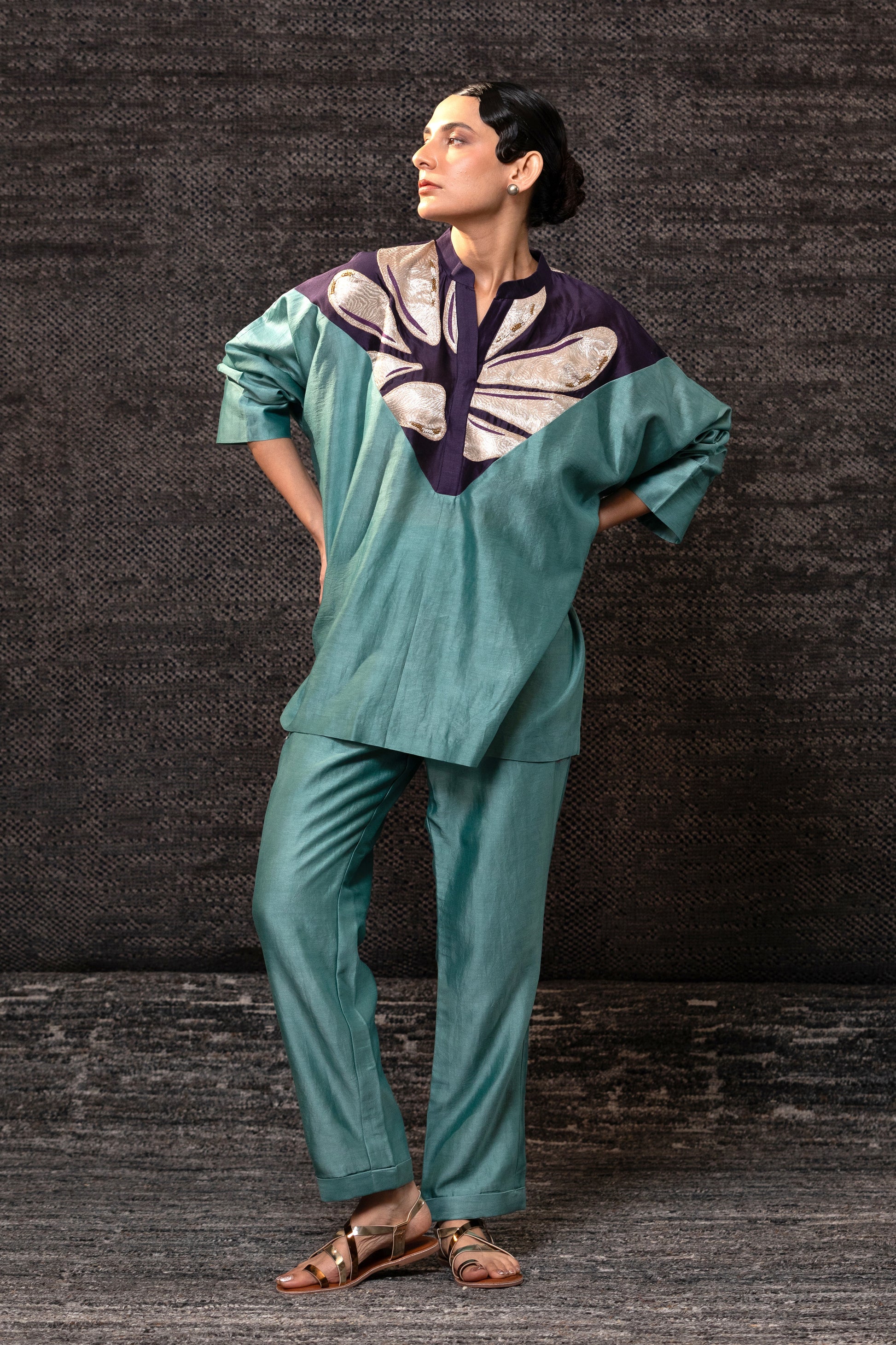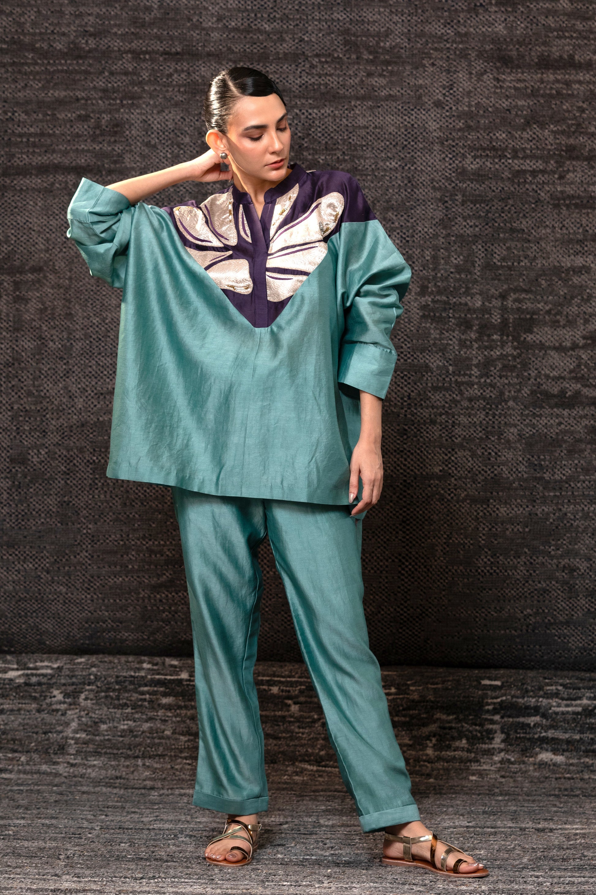 Relaxed silk-chanderi top with a soft drop shoulder and easy sleeves, finished with a statement brocade-tissue yoke across the chest.Paired with straight, narrow pants.