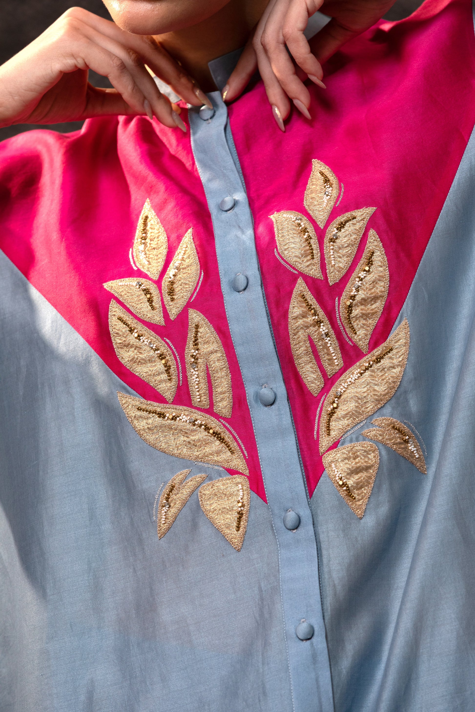 18 hours of hand embroidery on the yoke—each piece is subtly unique.