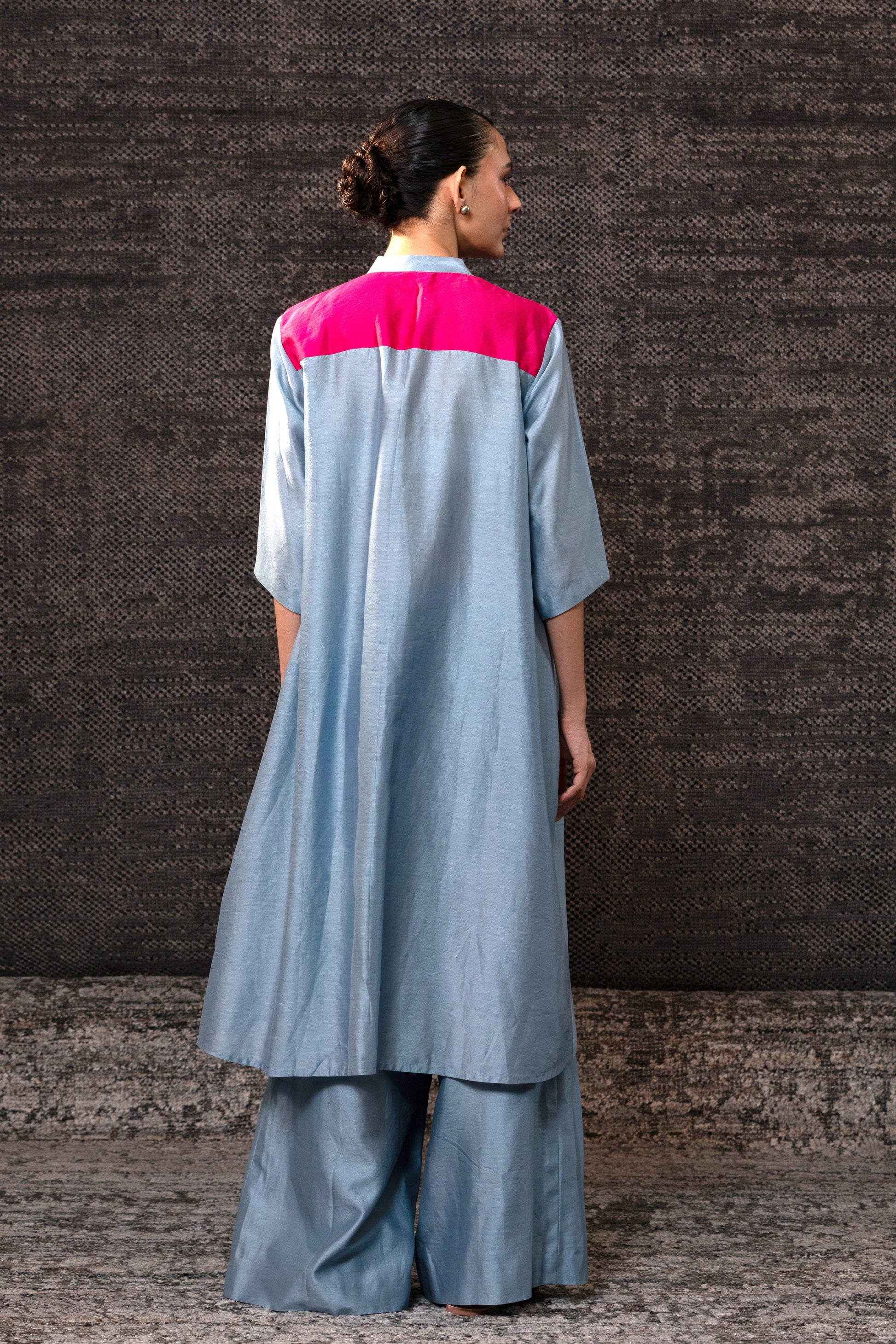 Silk-chanderi straight kurta with a statement yoke—hand-embroidered Benarasi brocade-tissue appliqué.