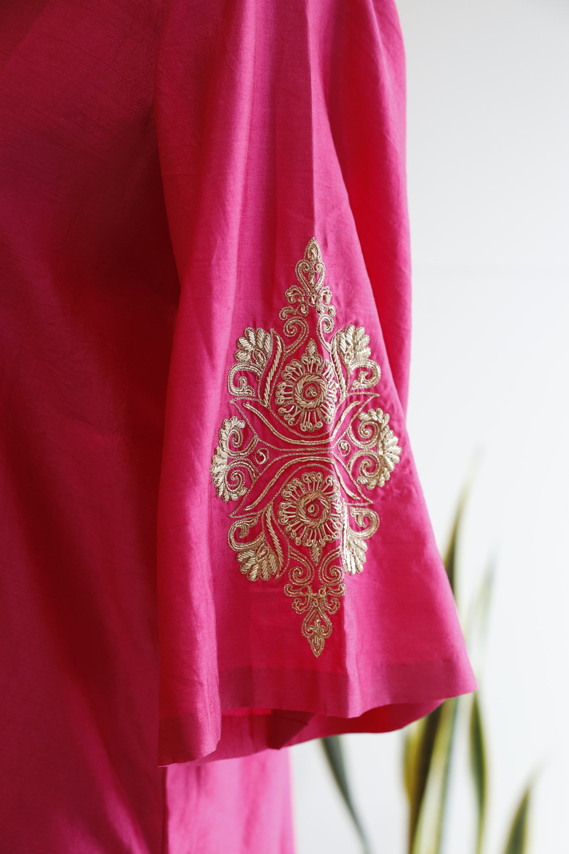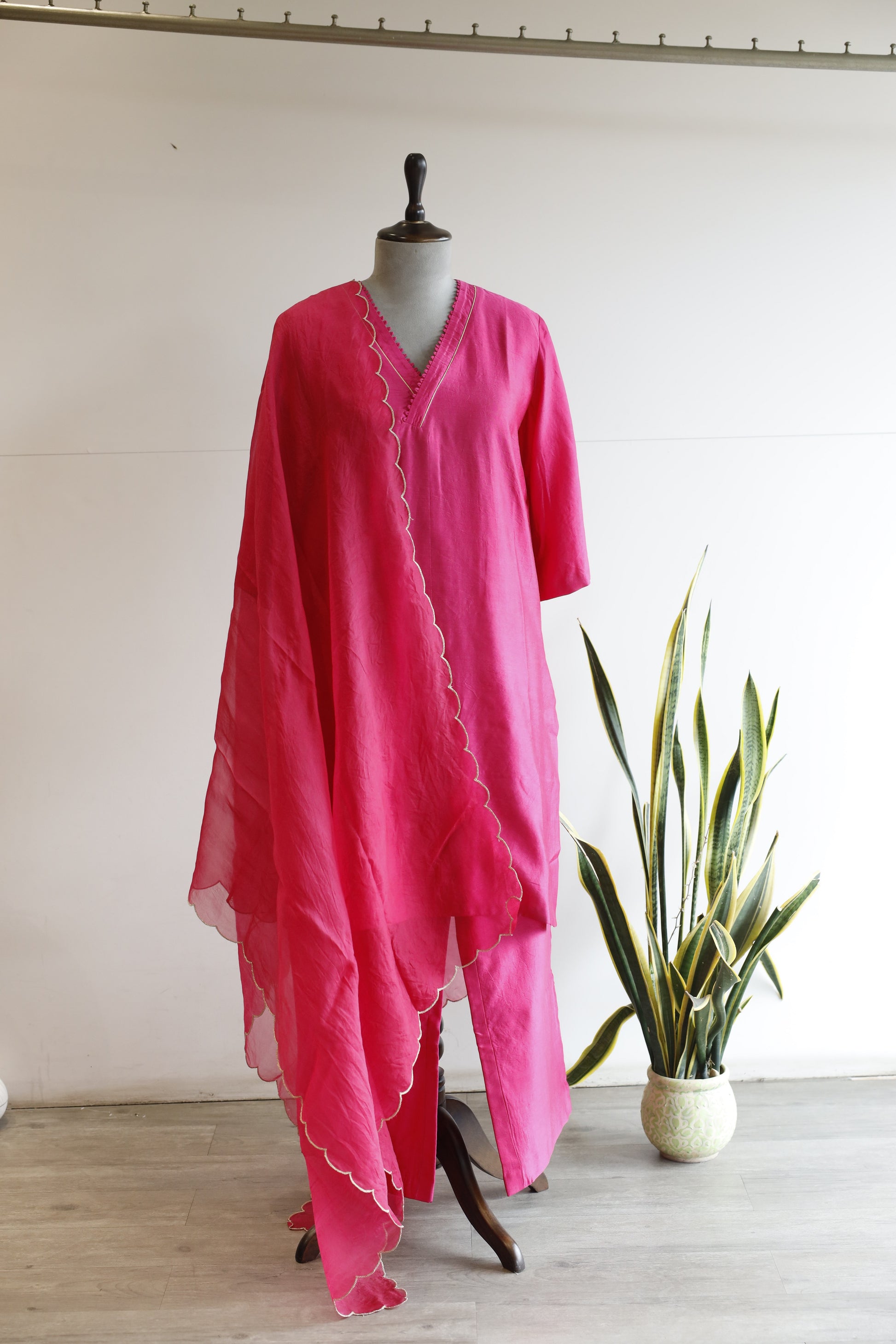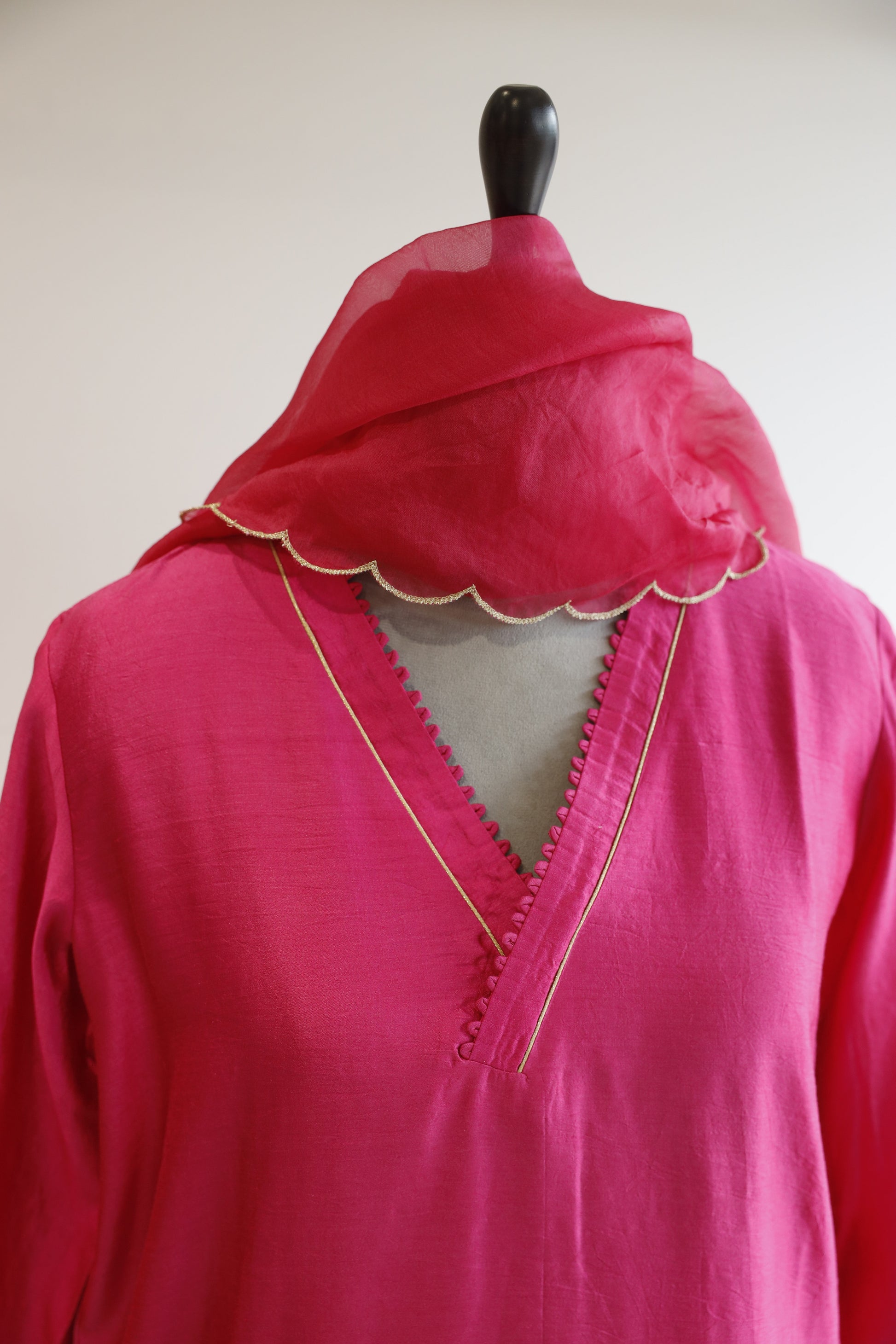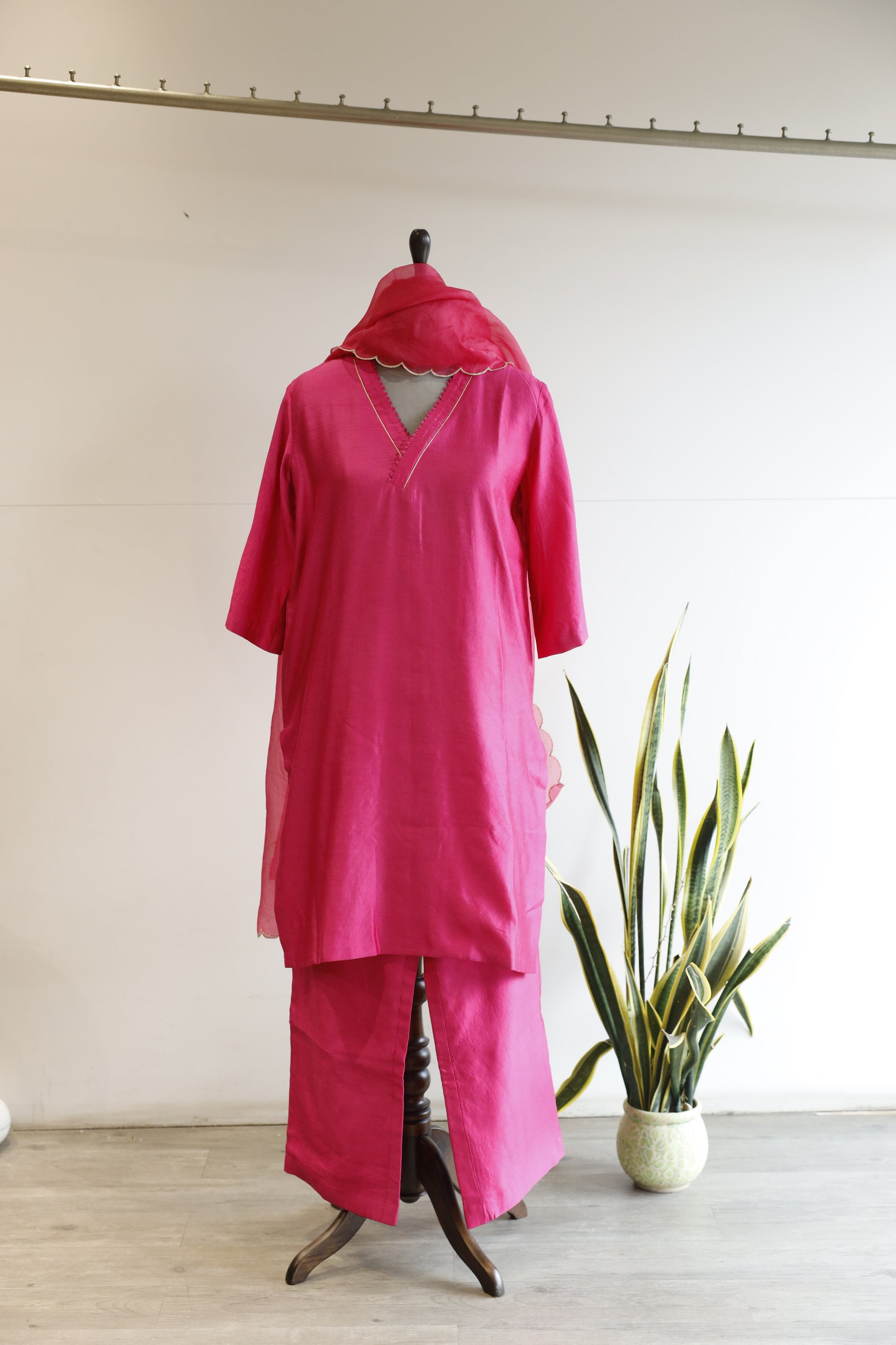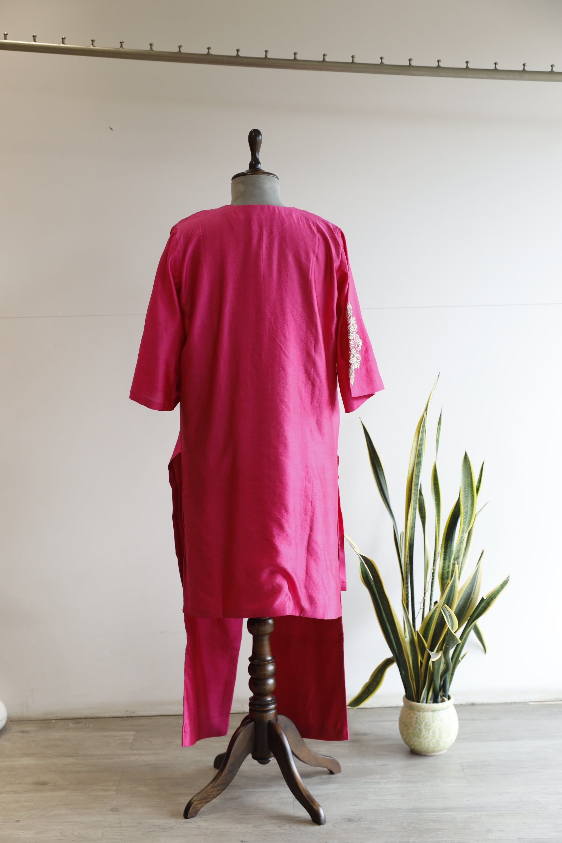 This vibrant two-piece set is a celebration of craftsmanship and color, featuring a knee-length kurta with a side slit adorned with hand-embroidered zardozi bootis. The elegant V-neck is beautifully framed with scallop detailing, while the 3/4 sleeves are finished with button loops, adding a refined touch. Paired with it are straight-fit silk pants.