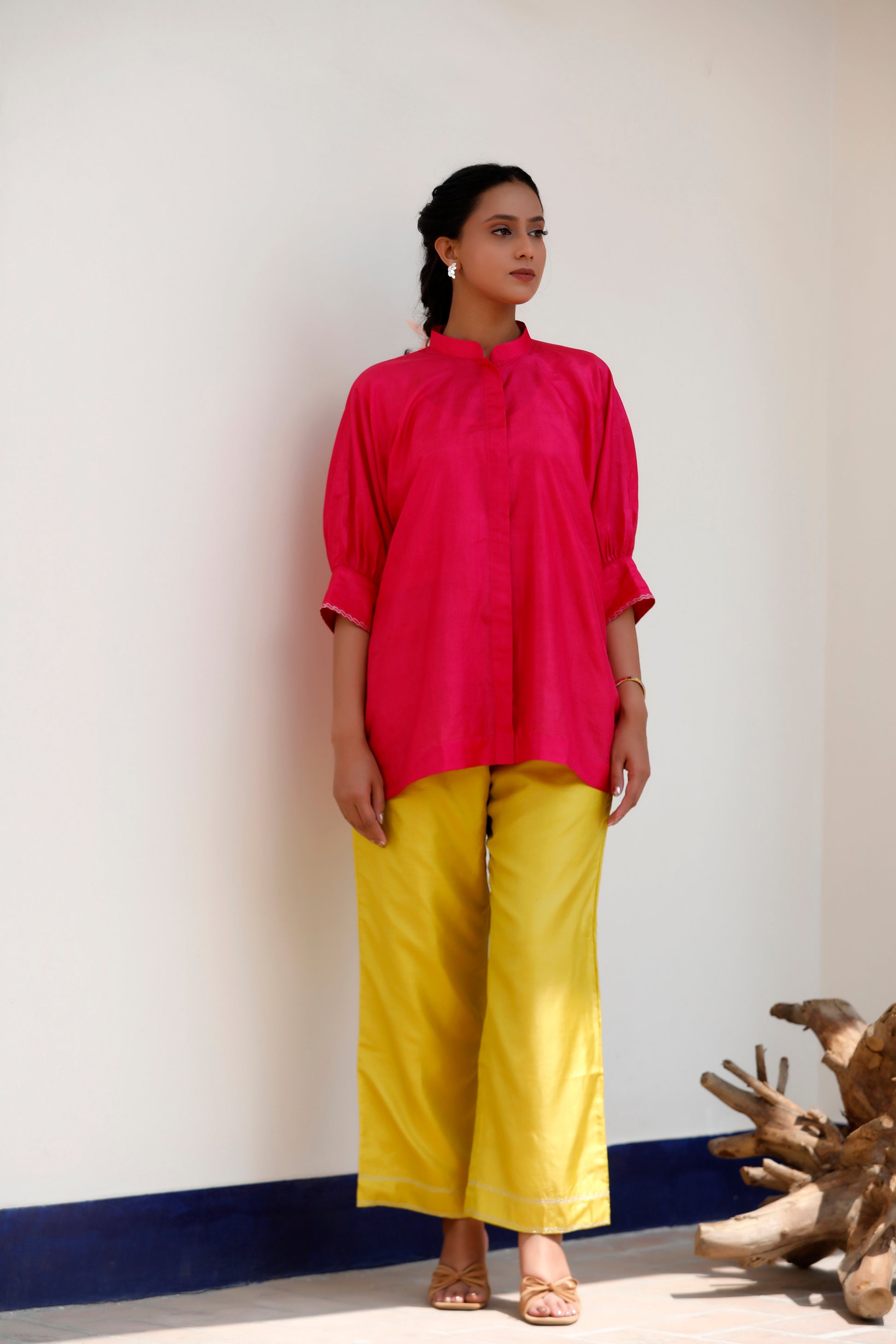 Tailored yellow silk pants with subtle embroidery at the hem. Styled here with the Rihla Kurta for a bold contrast look.