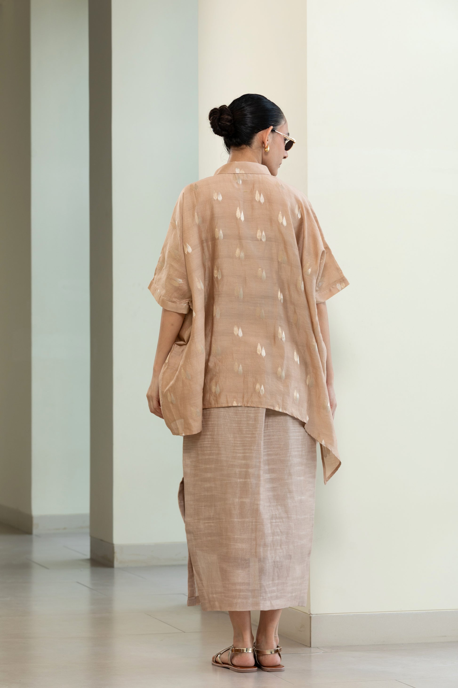 Elevate your everyday wardrobe with our Asymmetrical Chanderi Shirt, a modern take on effortless luxury. Crafted from pure zari booti chanderi this flowy and breathable piece drapes beautifully, offering a relaxed yet polished look.