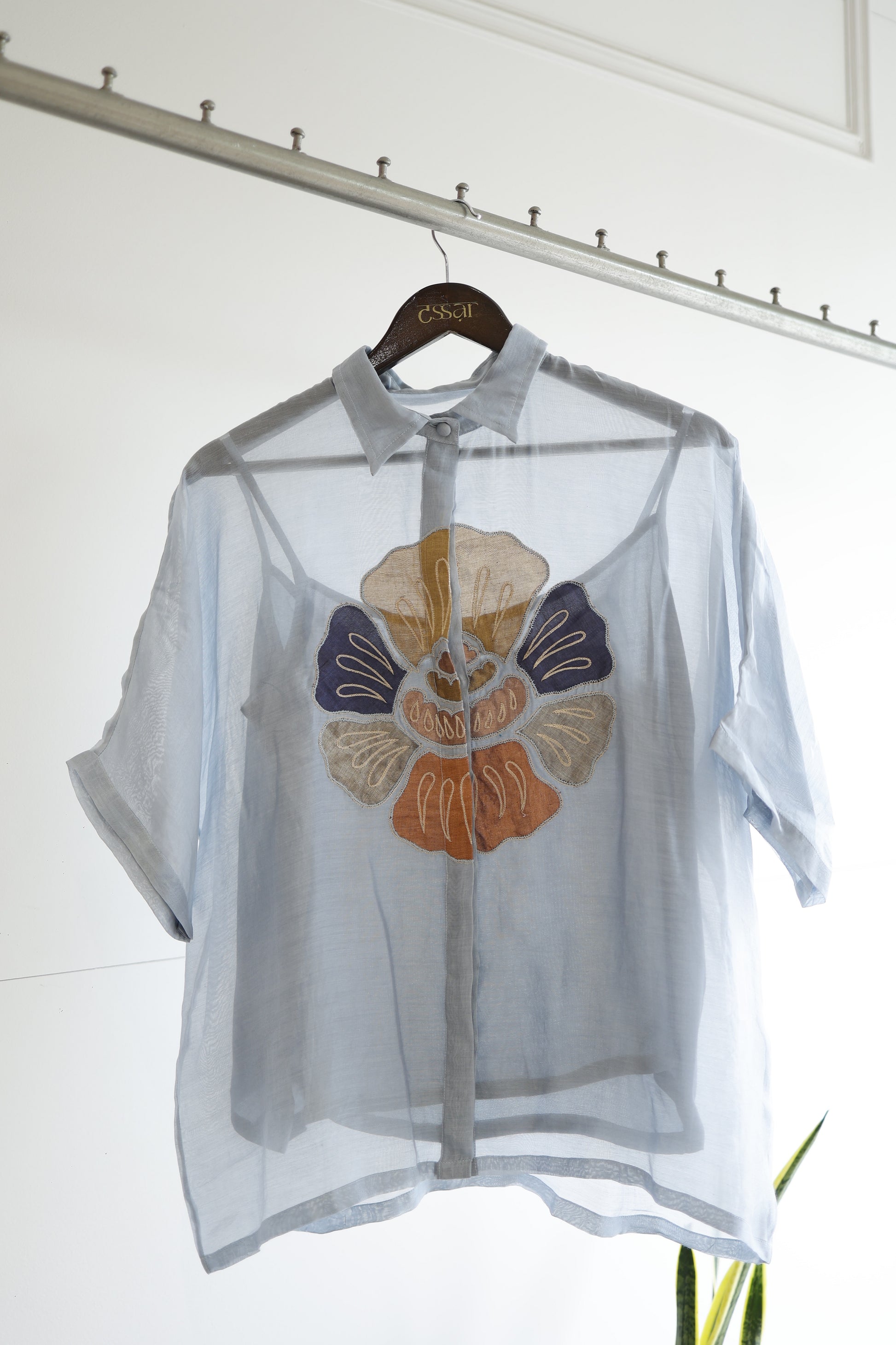 This relaxed-fit shirt is crafted in lightweight viscose silk and features a bold hand-patched floral motif on fine tissue. Comes with a matching inner,