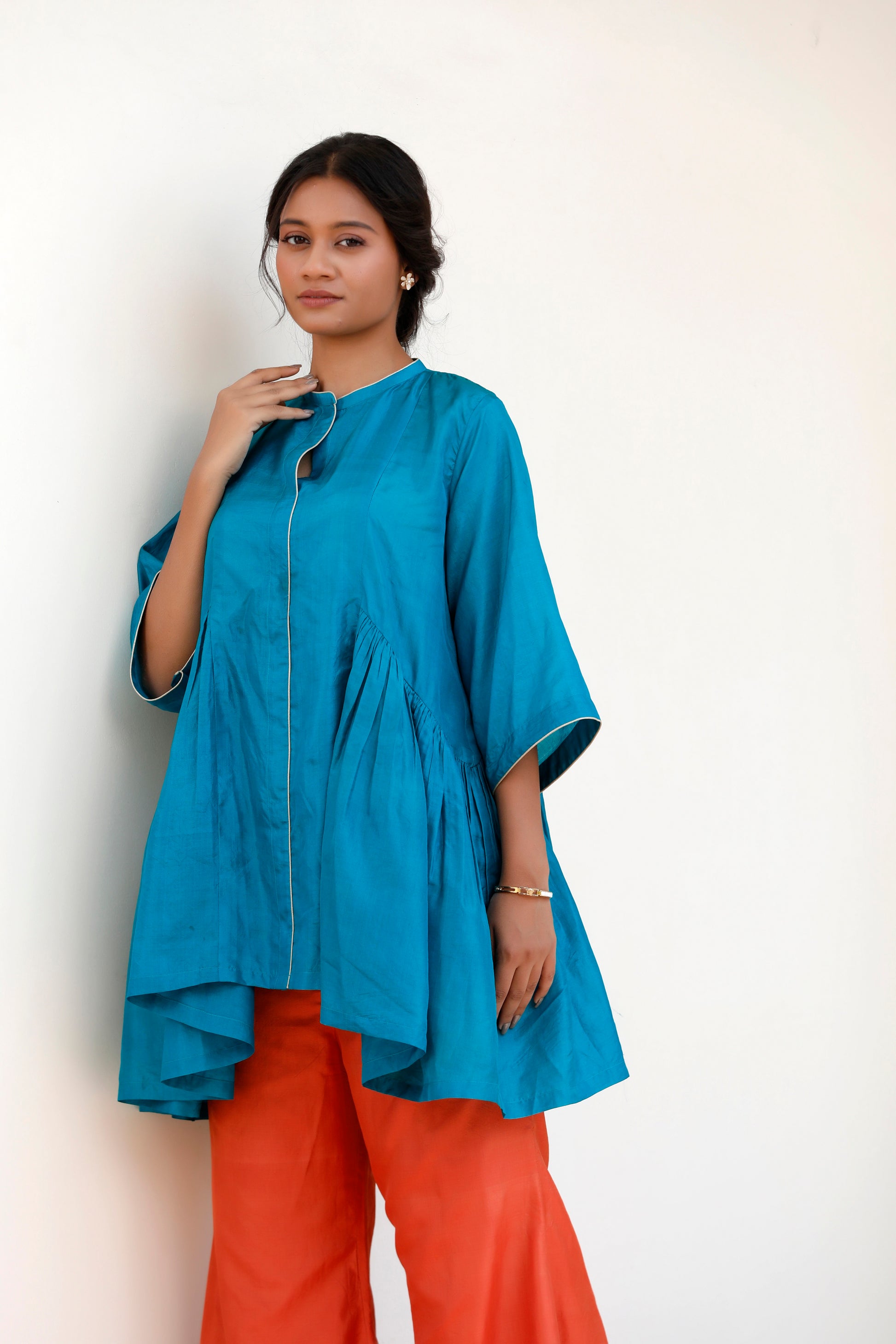 A 100% silk short kurta with a band collar, flared sides, and gathered panels. The back features bird embroidery with chain embellishments.