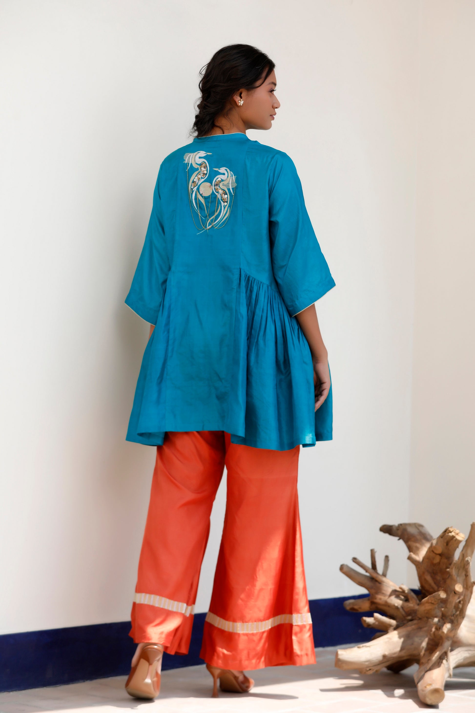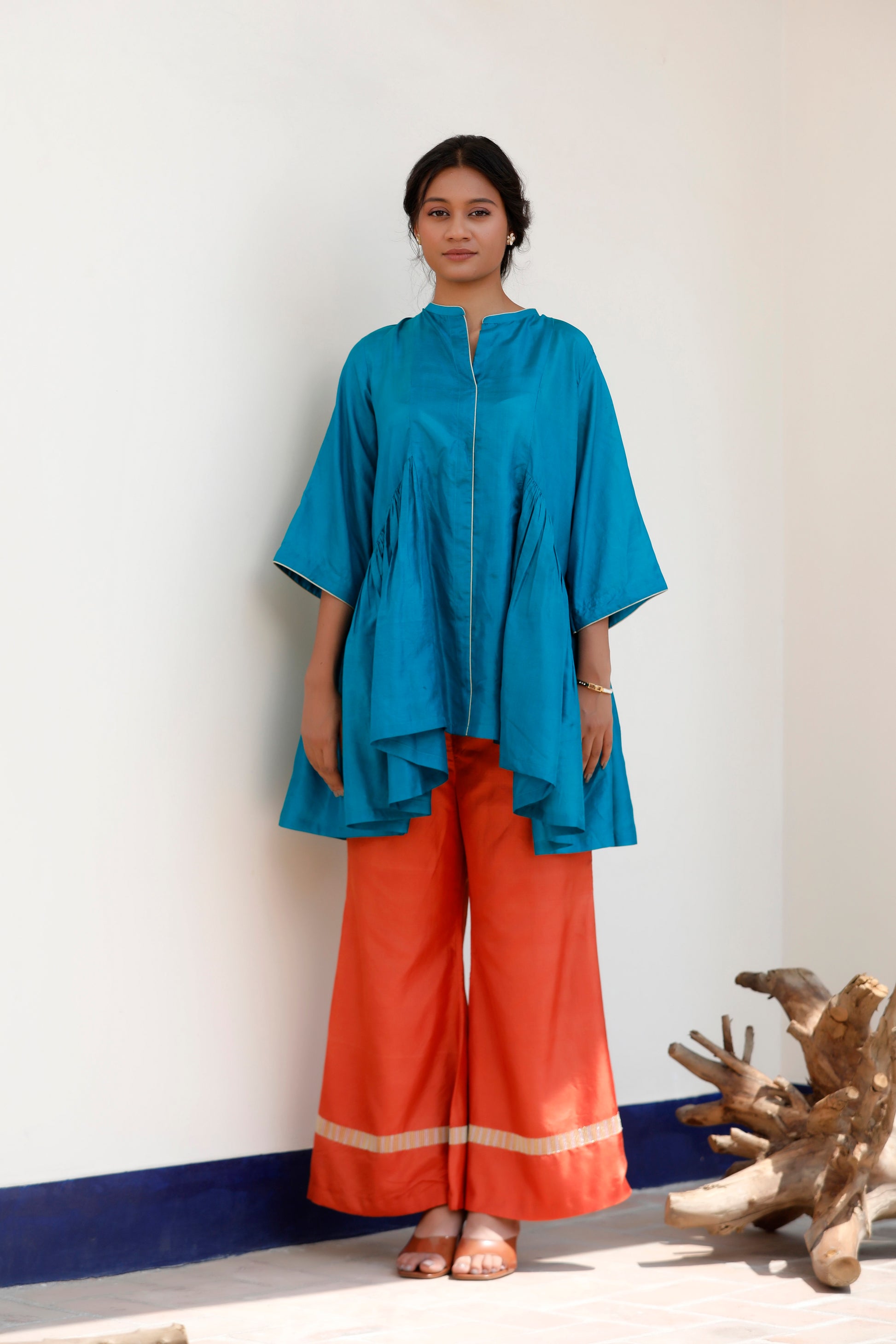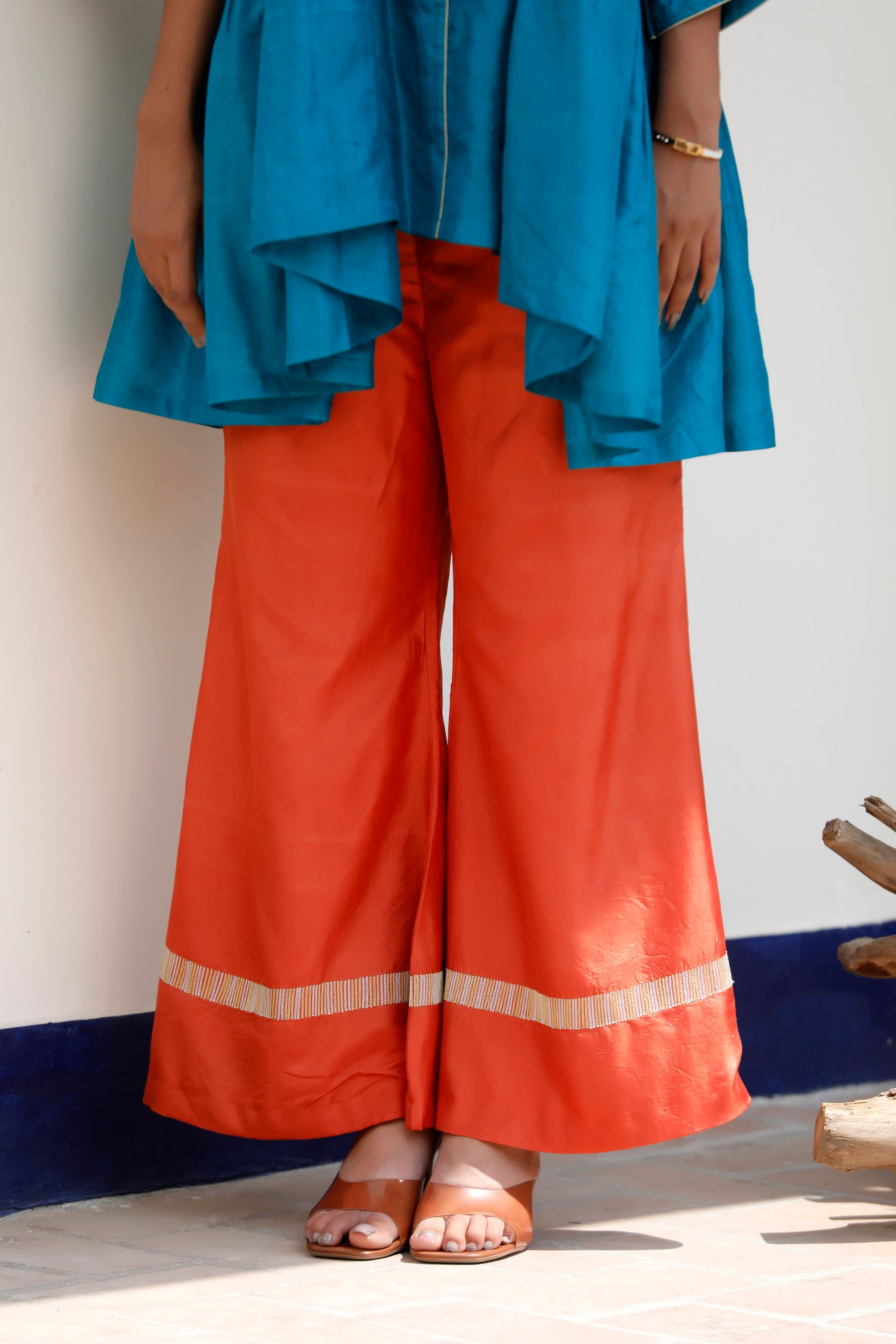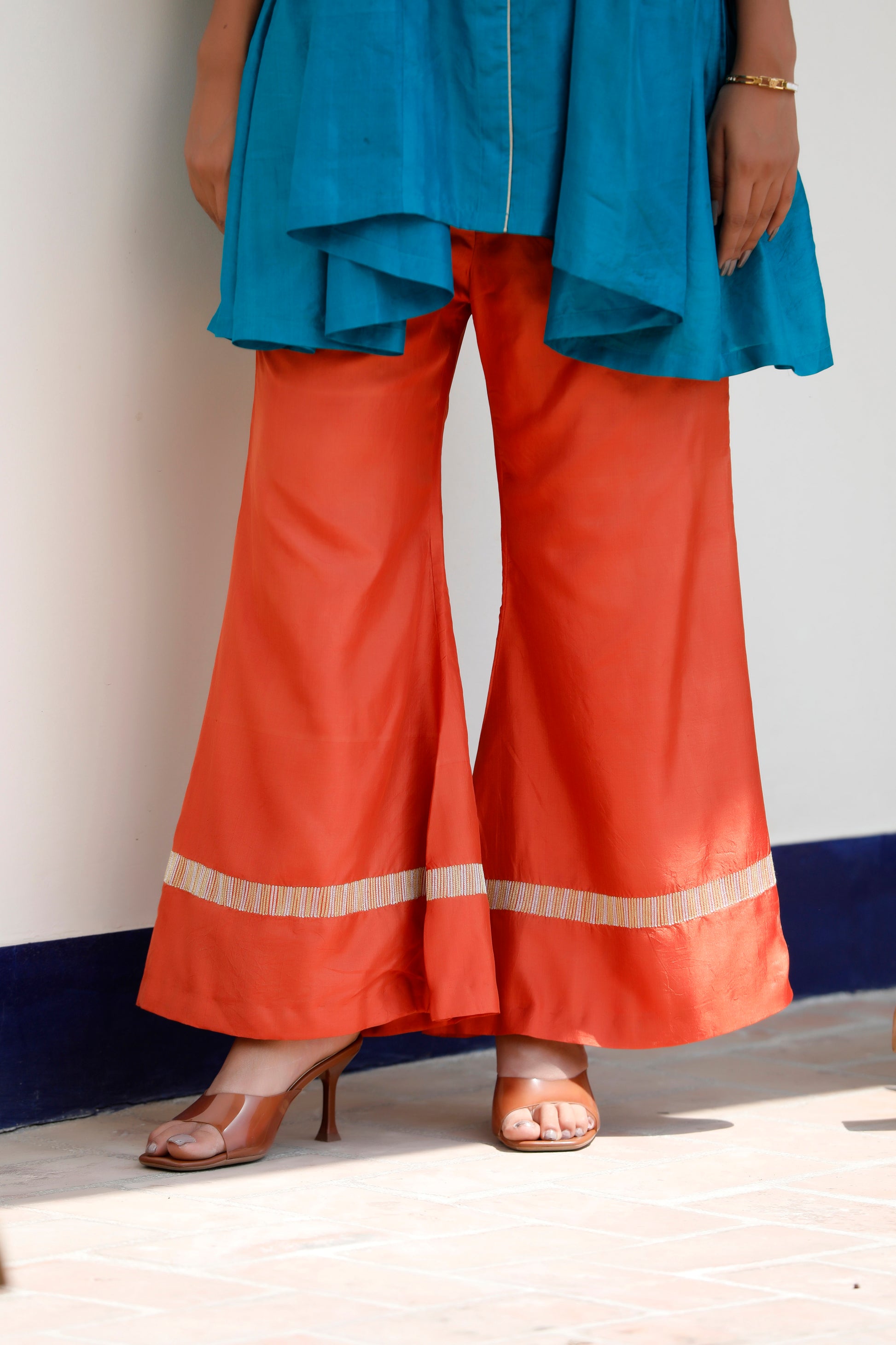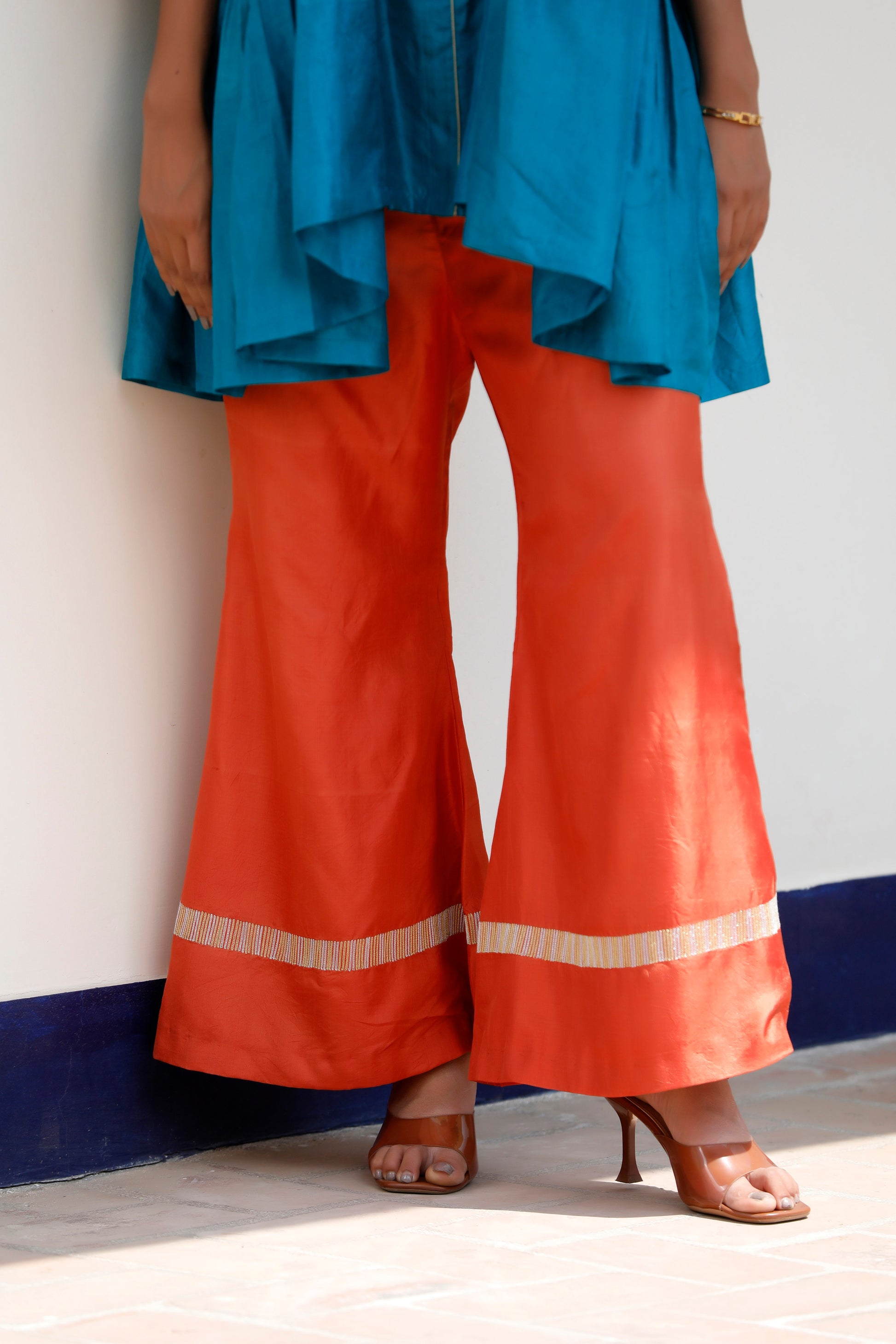 Flared silk pants in orange, finished with subtle embroidery along the hem. Styled here with the Saaz Kurta for a bold, color-blocked look.