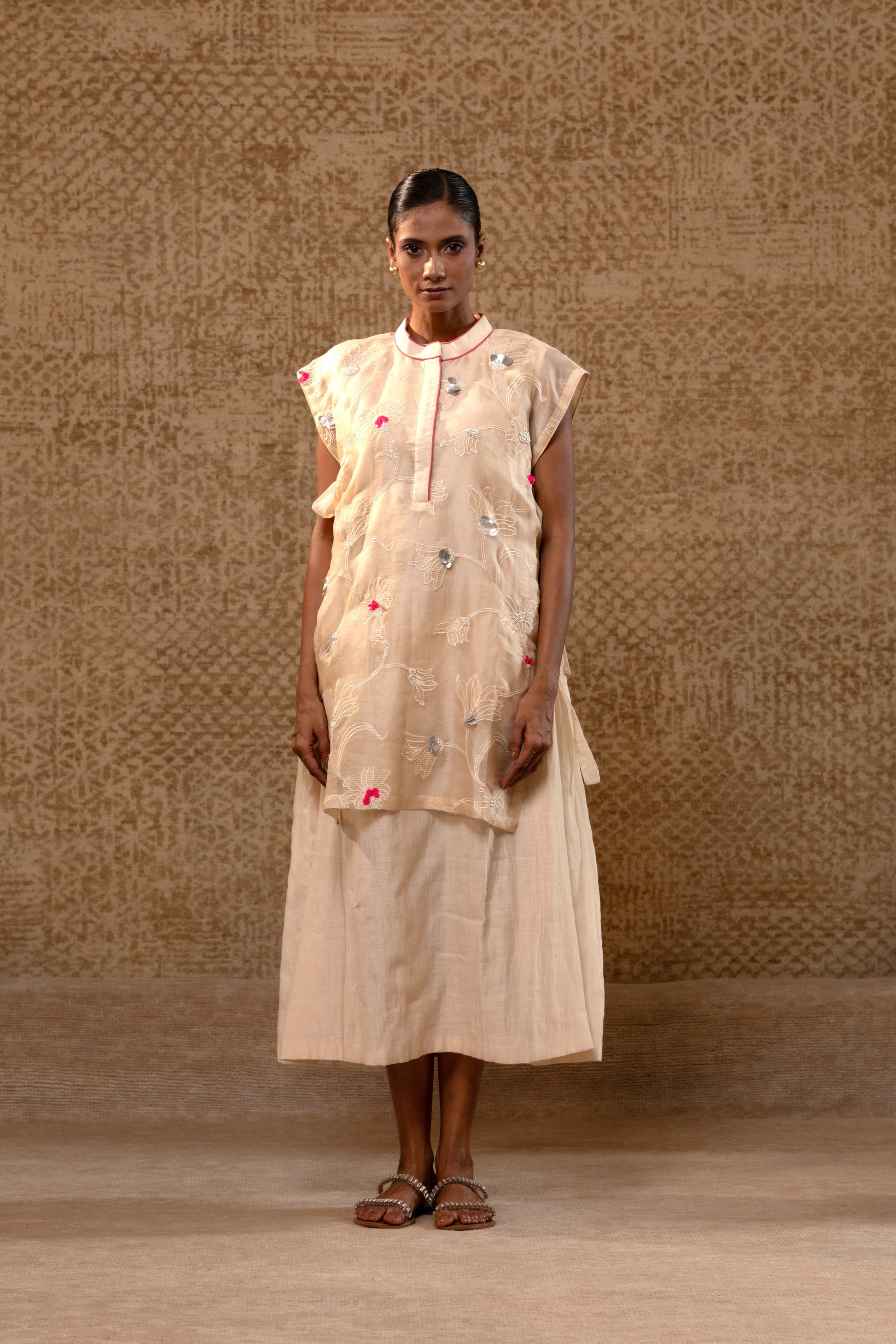 A two-piece set featuring a voluminous base dress layered with an embellished organza overlay. The overlay is appliquéd with zari-woven Chanderi fabric and delicately adorned with scattered sequins — capturing movement, light, and craftsmanship in every fold.