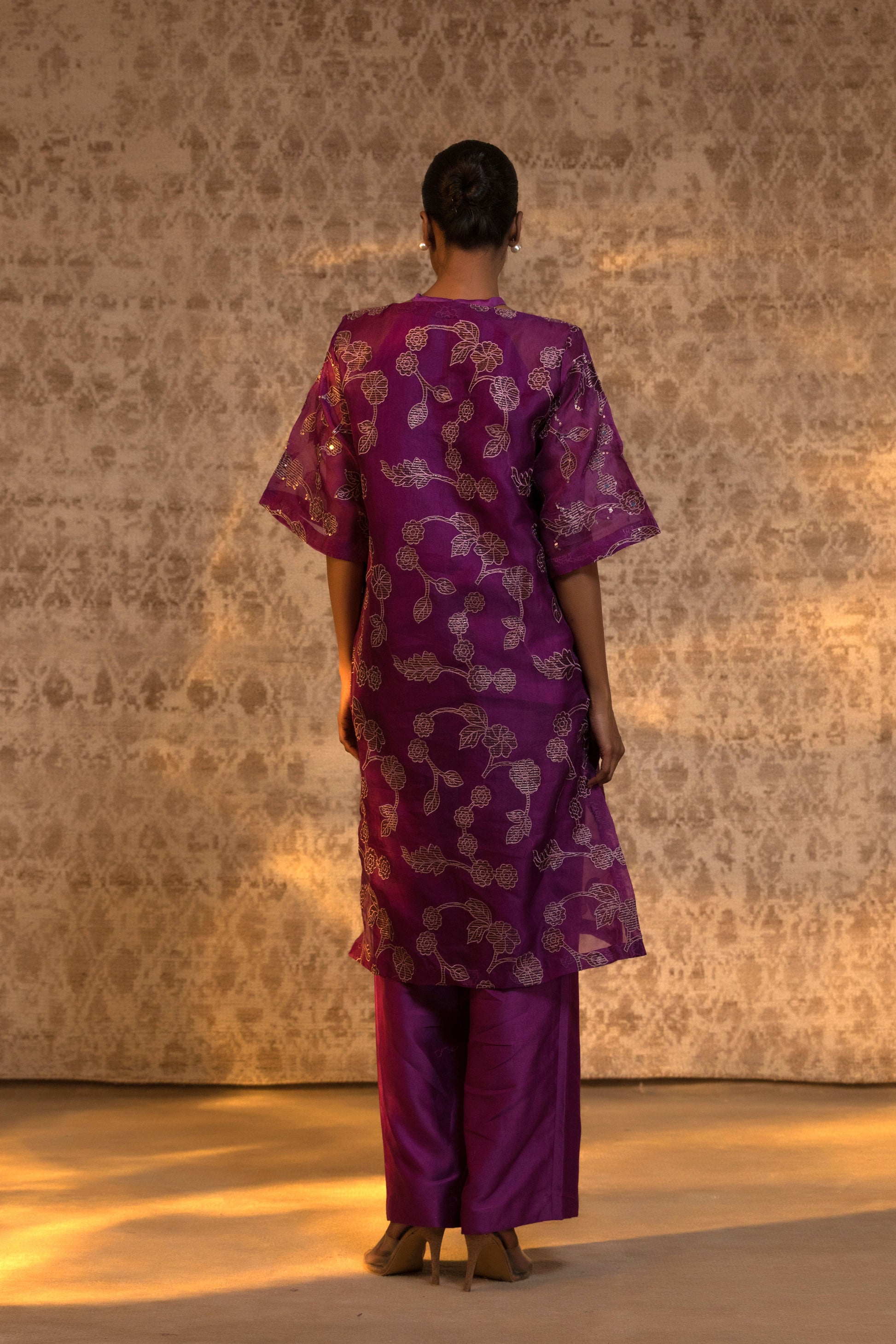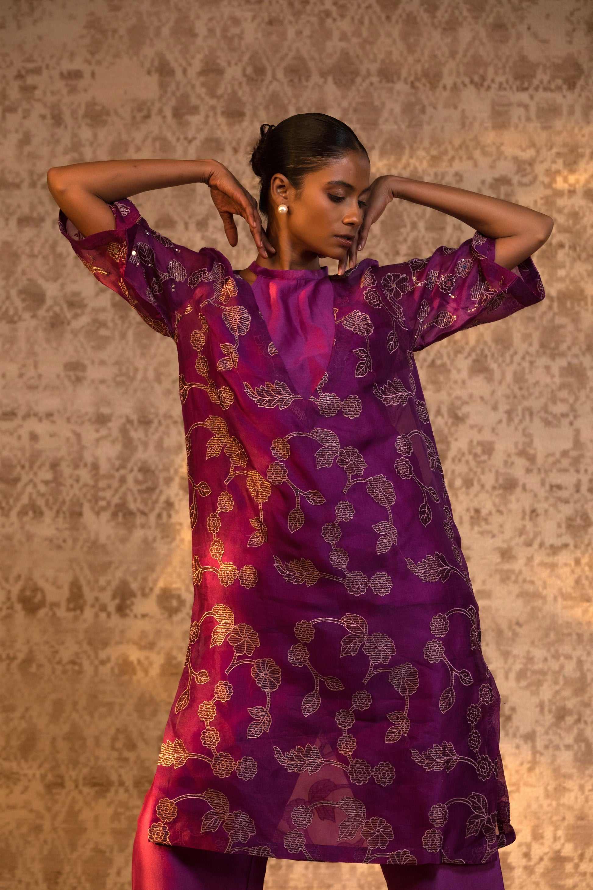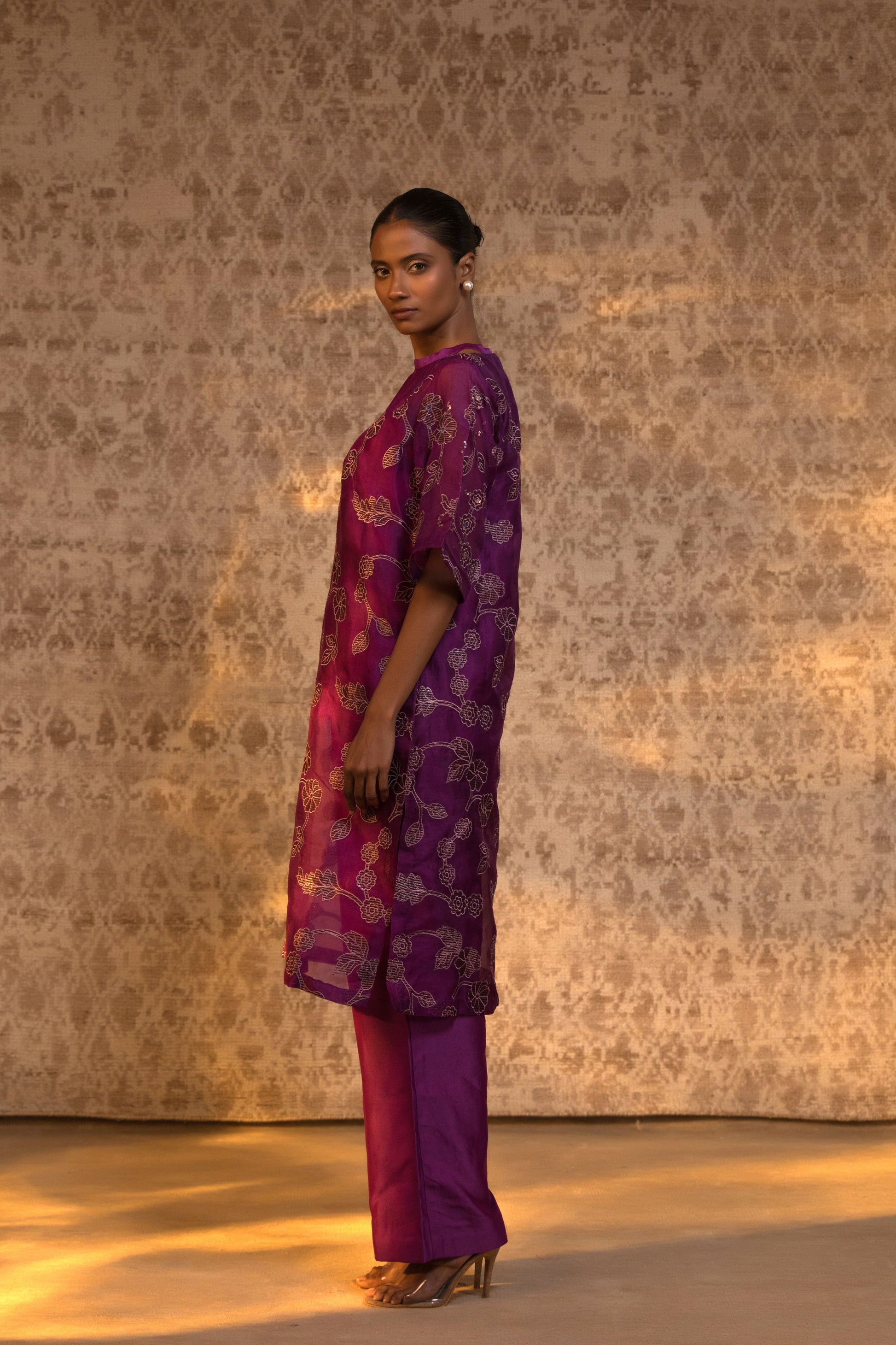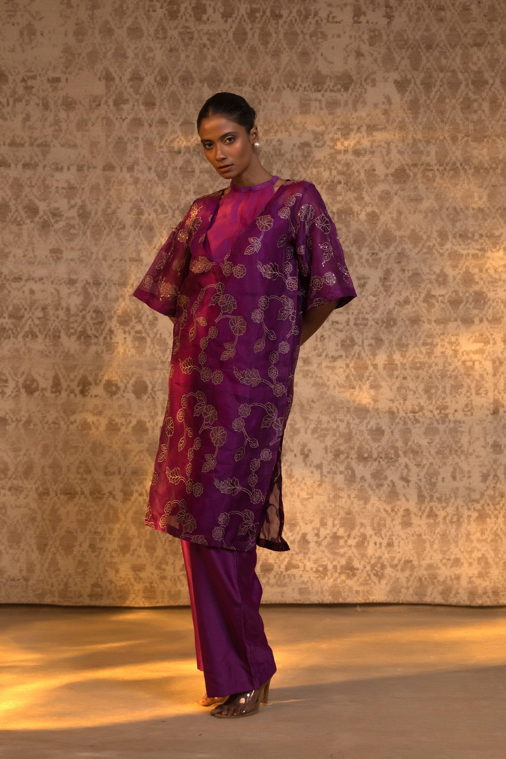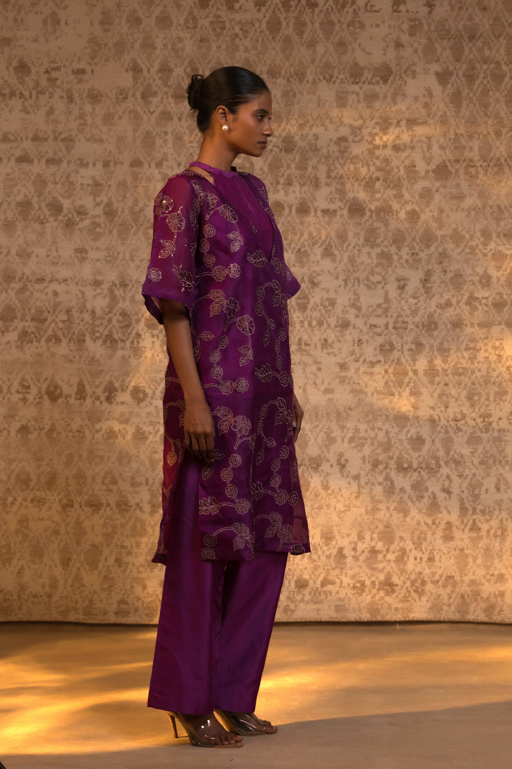 From the Taral collection, this relaxed yet striking halter kurta set is crafted in pure organza silk, detailed with handcrafted zari Chanderi appliqué and subtle embellishment. The stylish halter inner is layered beneath a broad-neck kurta, creating depth and dimension while maintaining effortless movement.