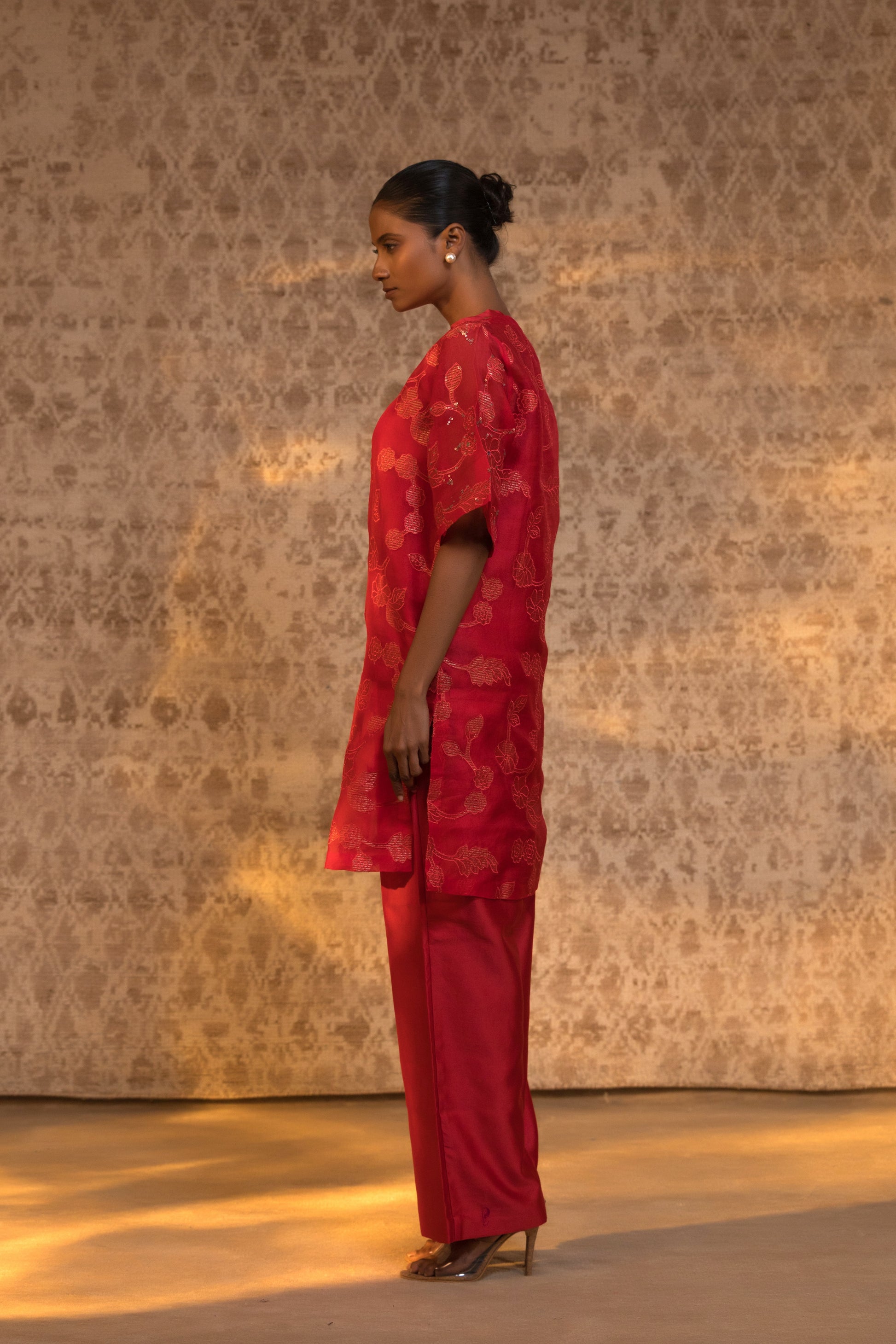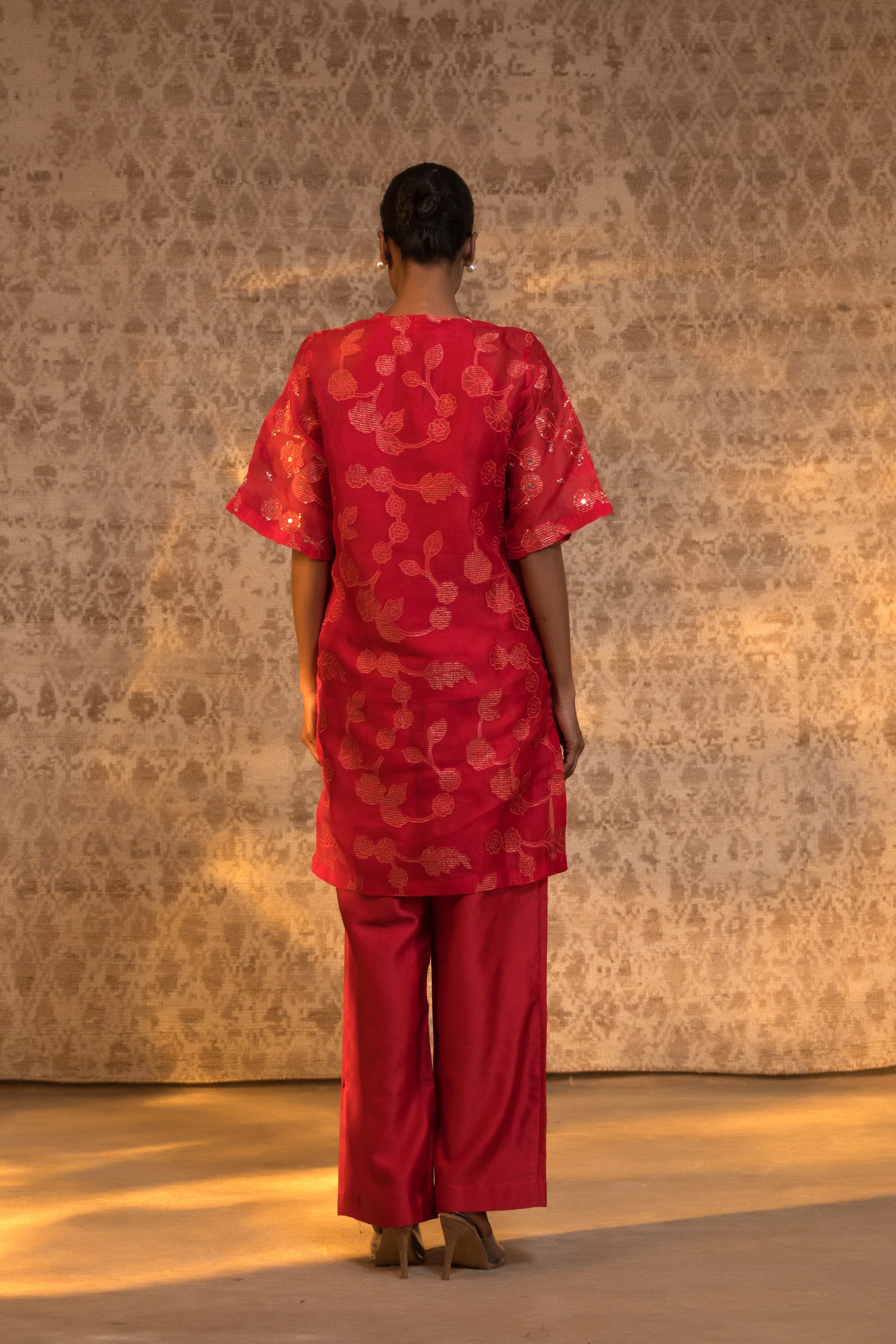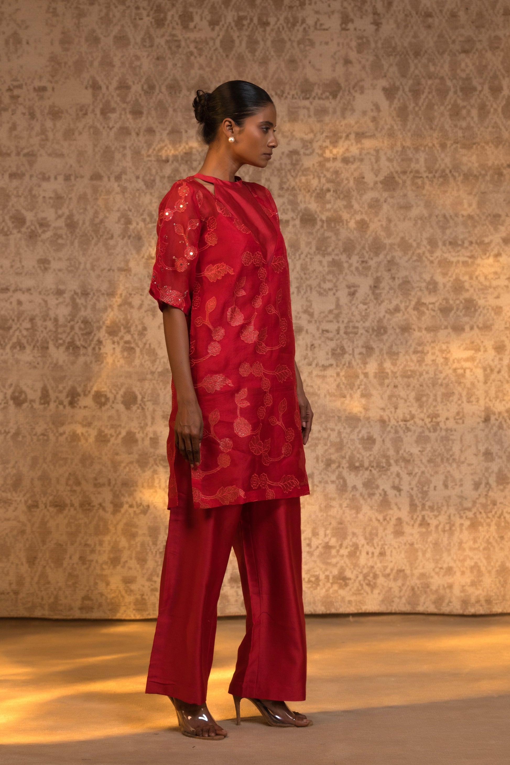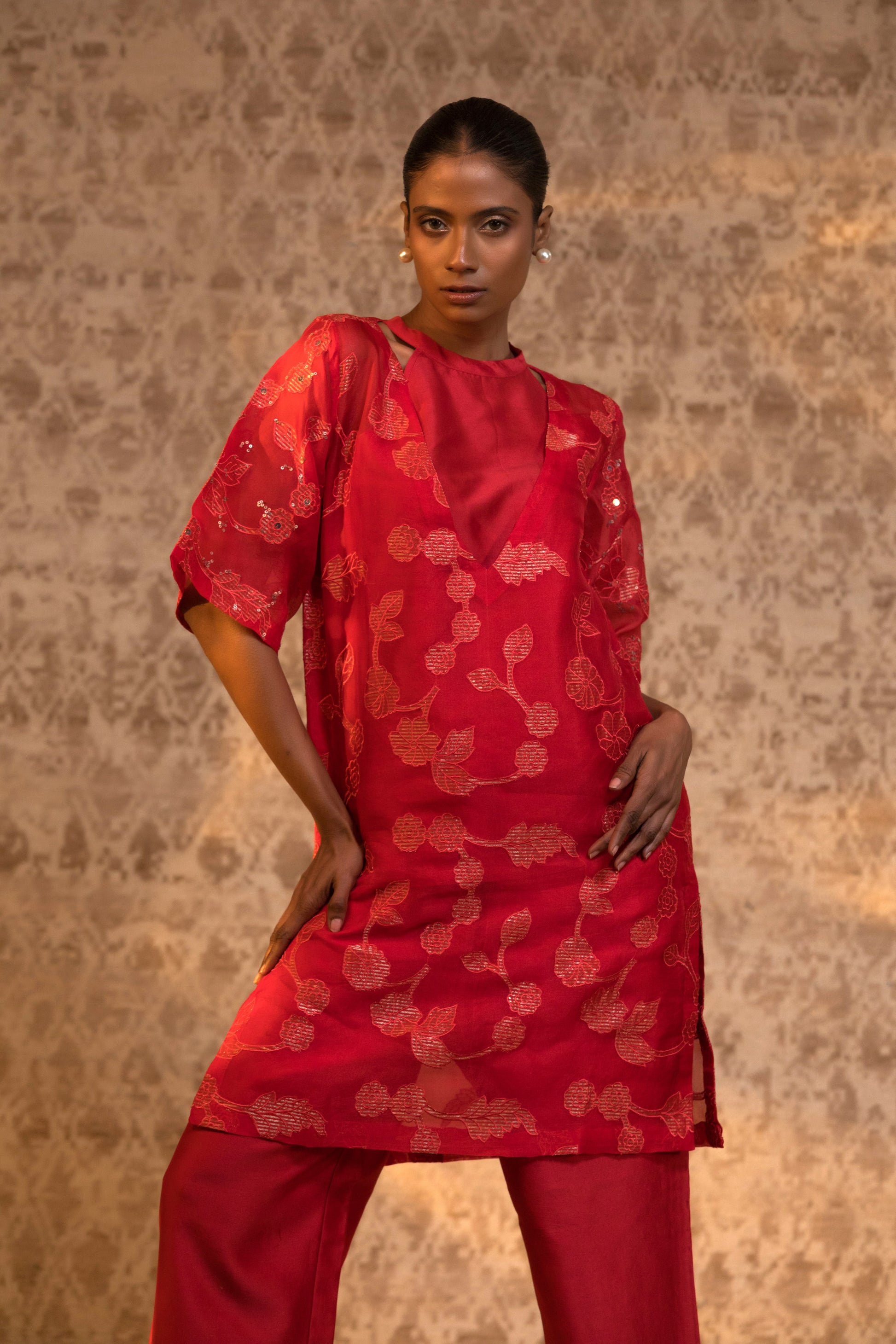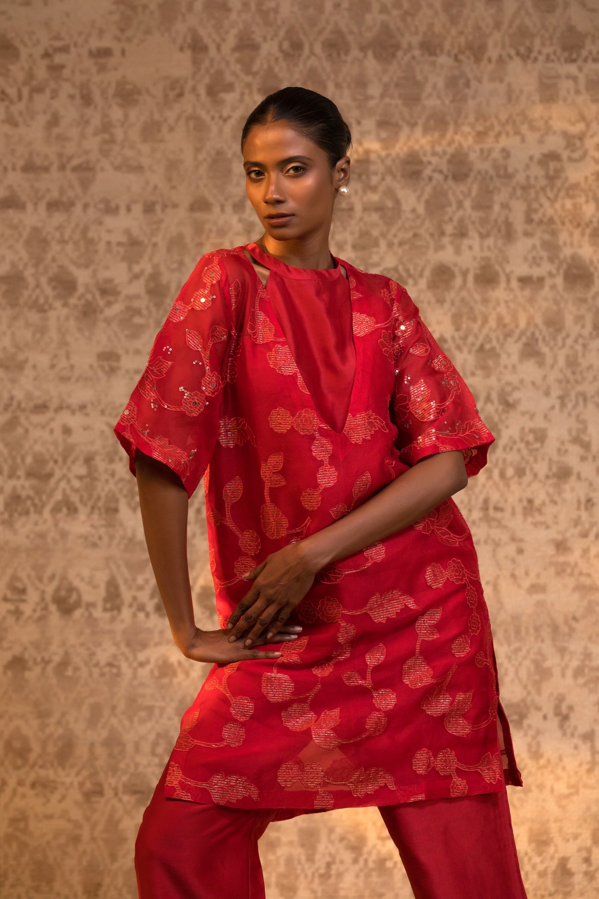 From the Taral collection, this relaxed yet striking halter kurta set is crafted in pure organza silk, detailed with handcrafted zari Chanderi appliqué and subtle embellishment. The stylish halter inner is layered beneath a broad-neck kurta, creating depth and dimension while maintaining effortless movement.