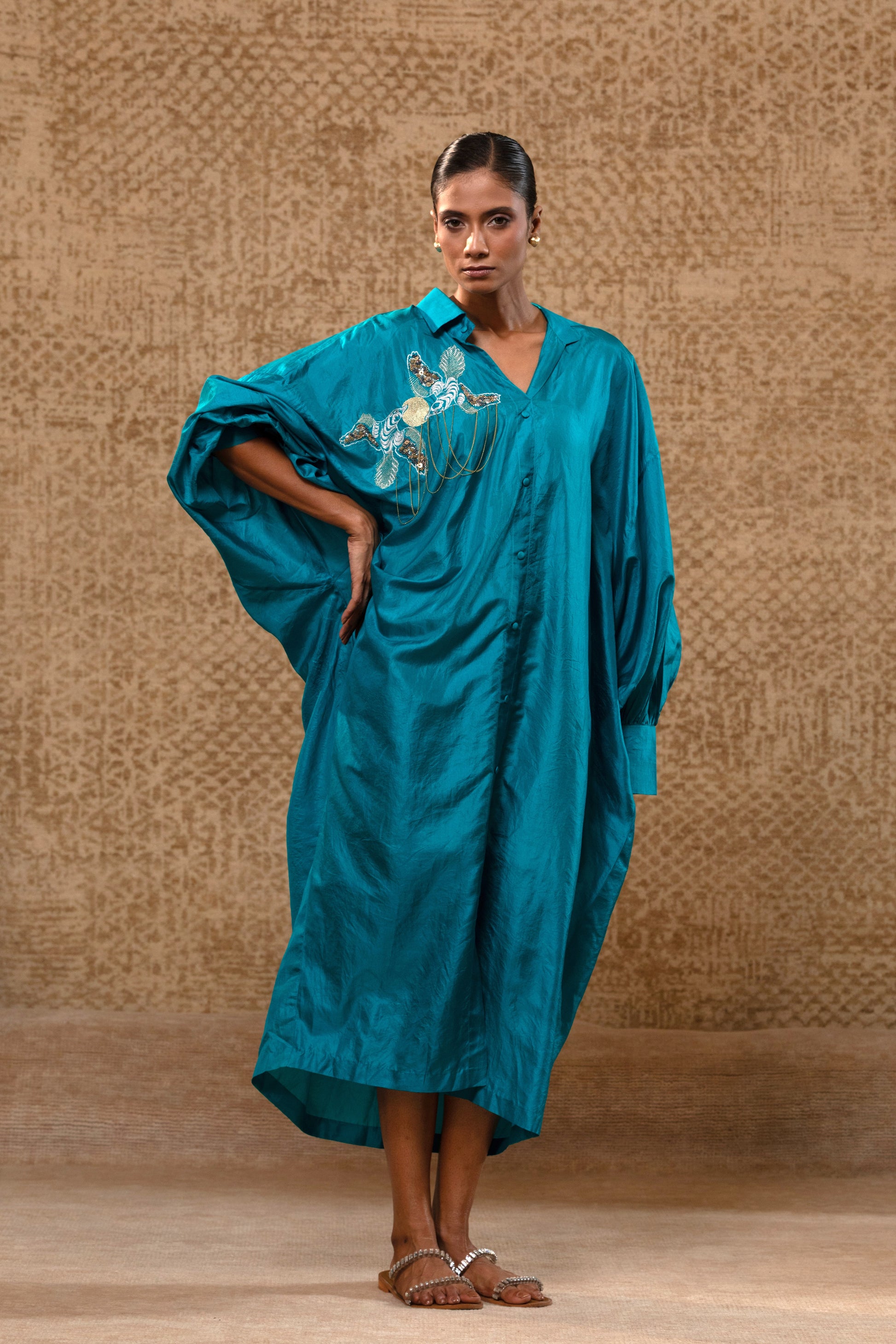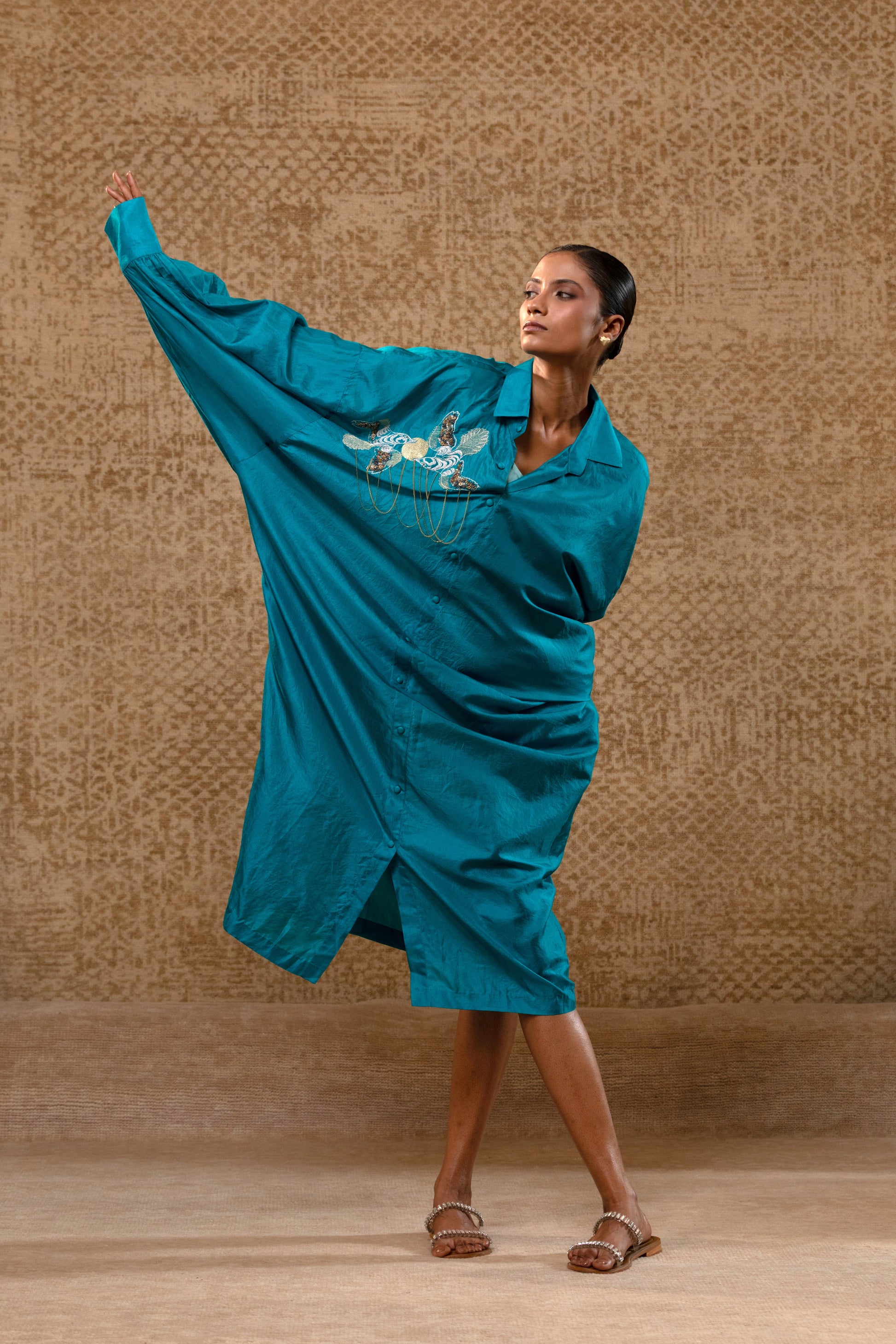 A relaxed-fit silk dress with sculpted sleeves and delicate chain embellishment. Designed to flow effortlessly while making an impact — this piece blends comfort with drama.