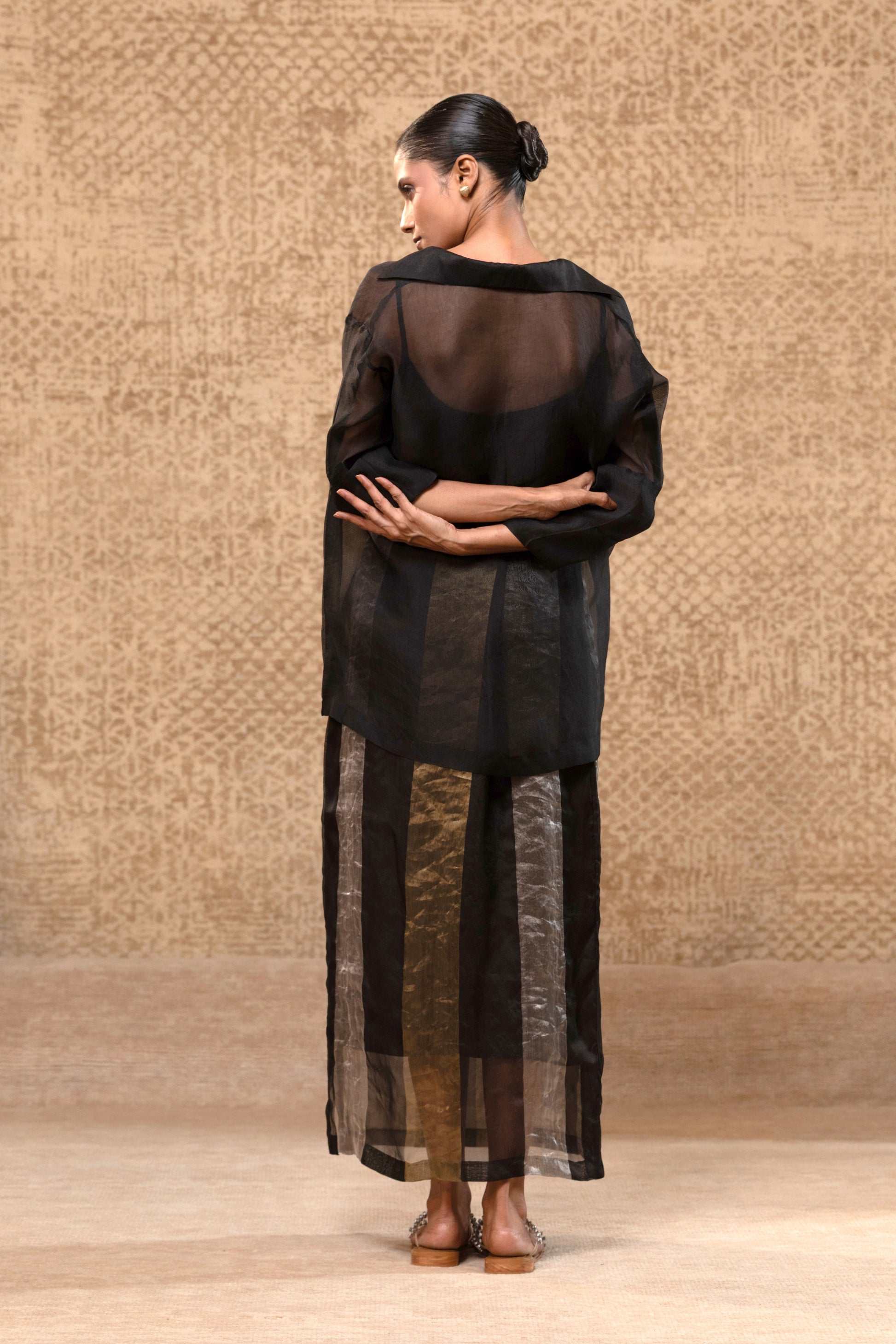 A sheer silk organza jacket adorned with intricate zardozi embroidery and delicate chain embellishments, layered over a coordinated bustier. Paired with a striking straight skirt crafted in silk organza with gold zari stripes — a contemporary silhouette with artisanal soul.