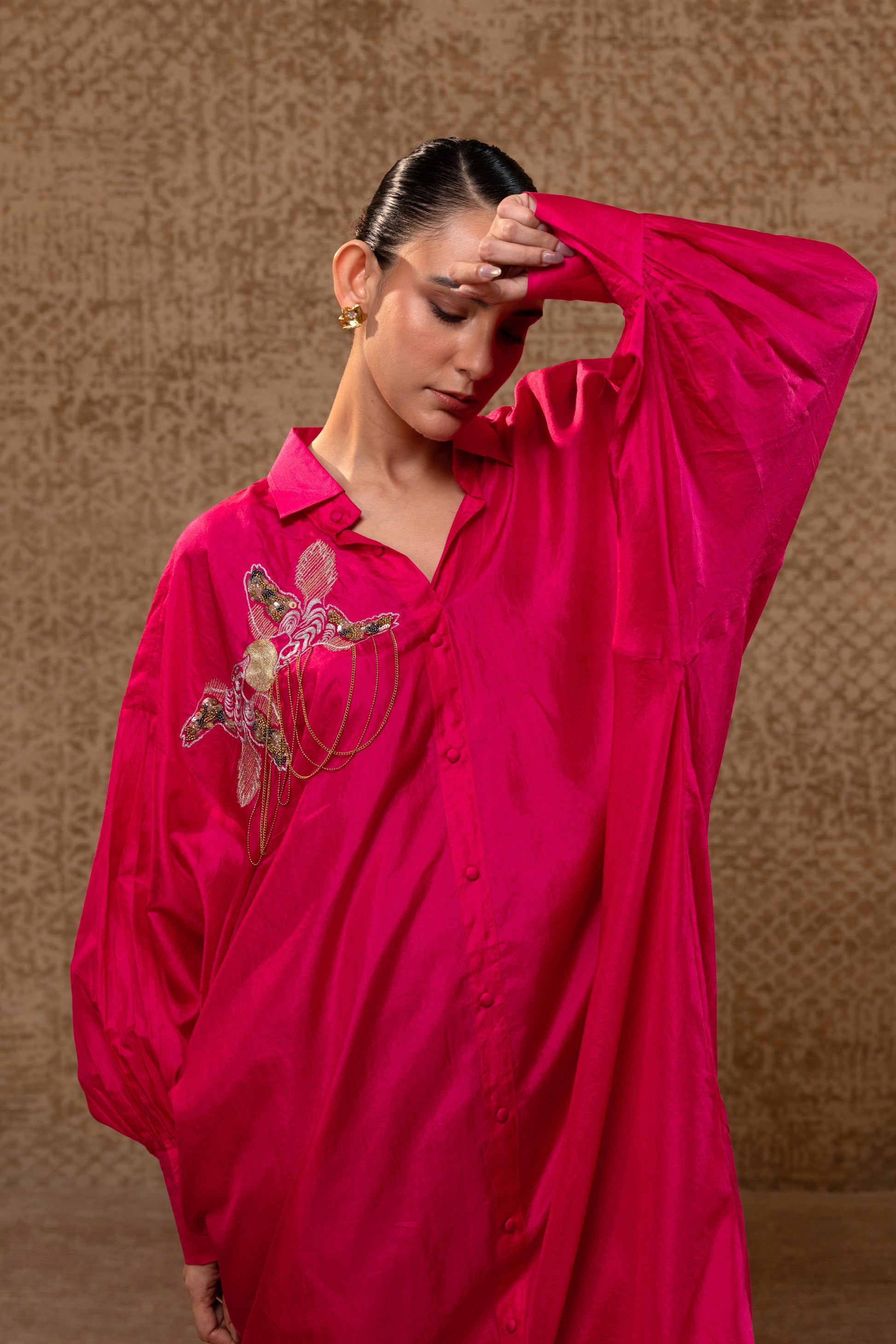 A relaxed-fit silk dress with sculpted sleeves and delicate chain embellishment. Designed to flow effortlessly while making an impact — this piece blends comfort with drama.