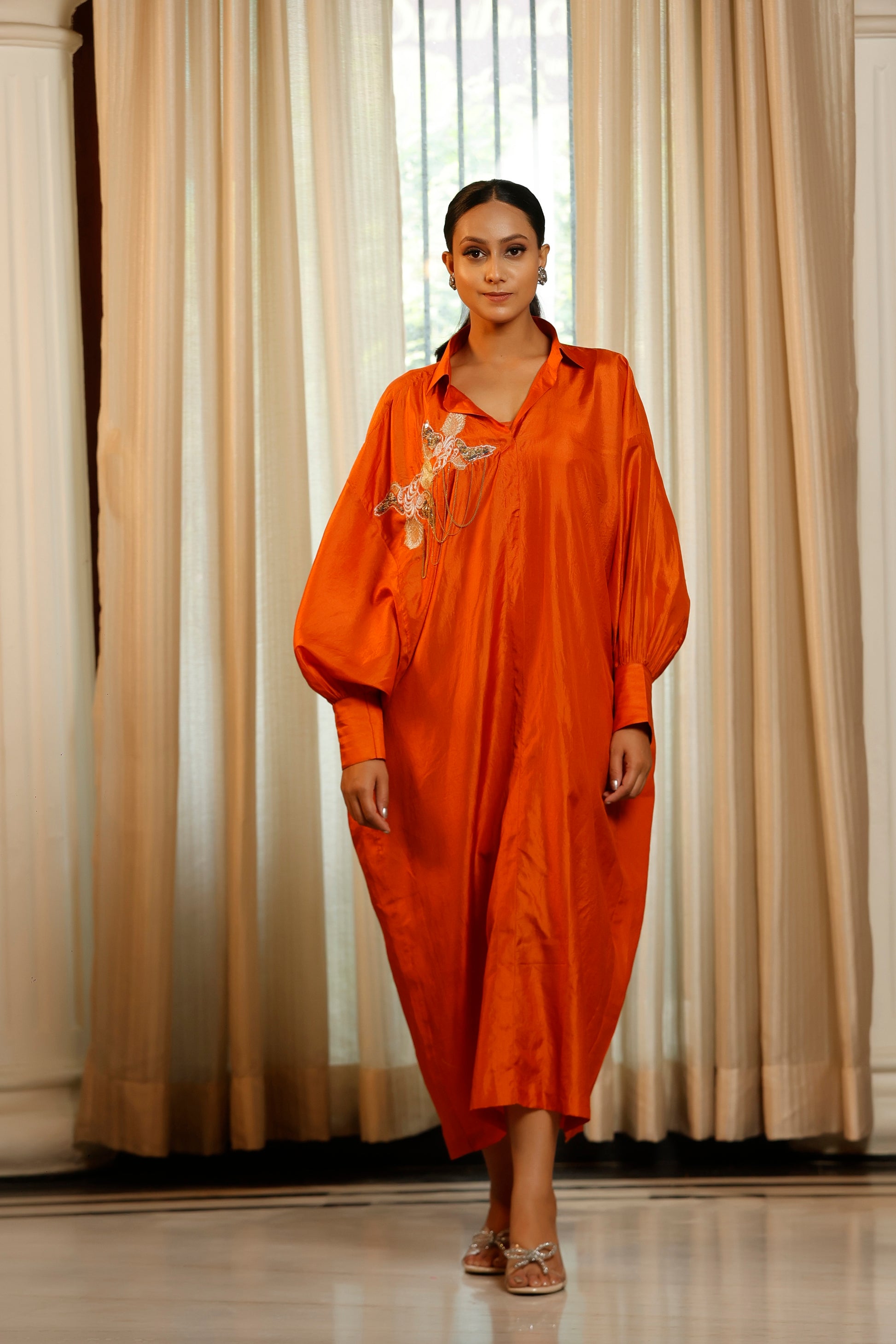A relaxed-fit silk dress with sculpted sleeves and delicate chain embellishment. Designed to flow effortlessly while making an impact — this piece blends comfort with drama.
